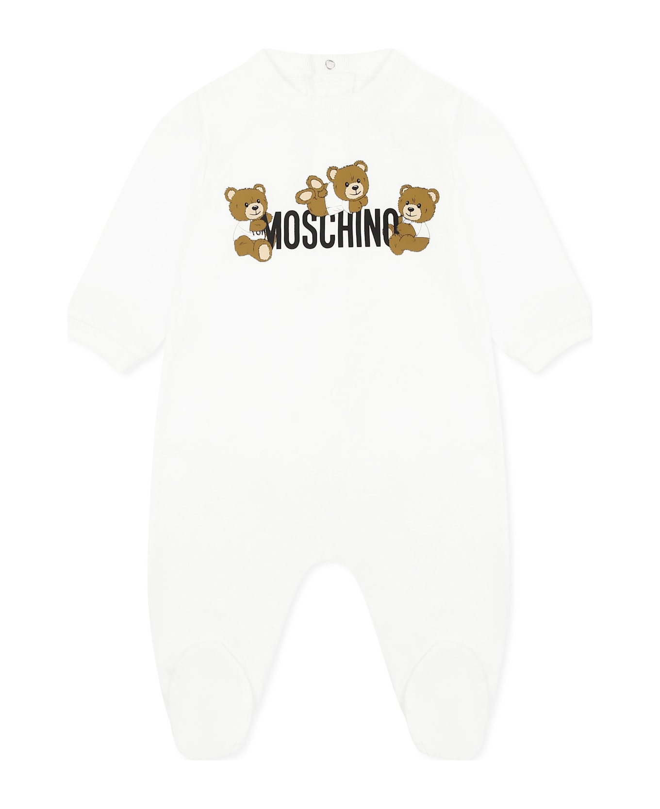 White babygrow from the Moschino Kids brand, in cotton, with long sleeves, ribbed crew neck and cuffs, feet and snap buttons on the back. It is embellished with three Teddy Bears and logo on the front.