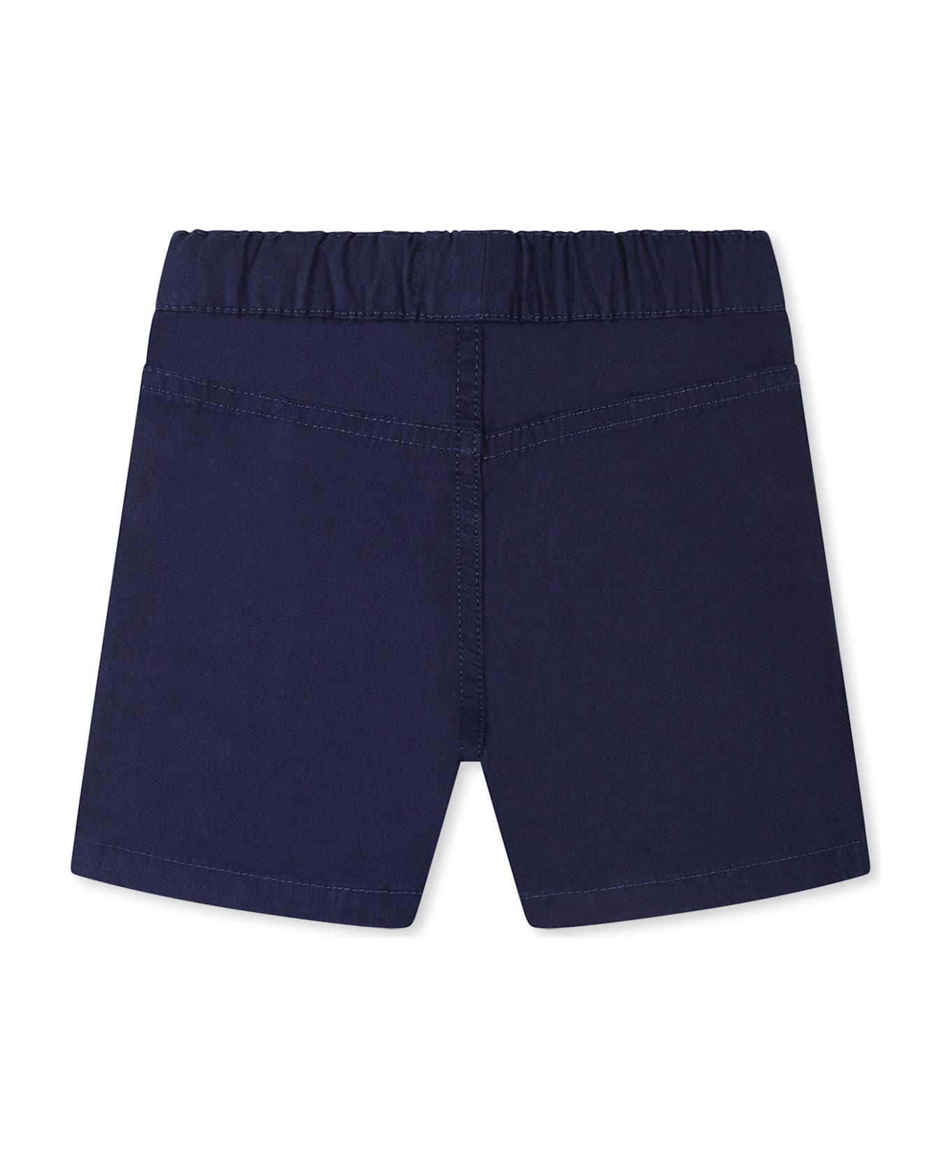 Blue cotton shorts, with elasticated waist, drawstring and patch pocket on the front. They are embellished with a logo on one leg.