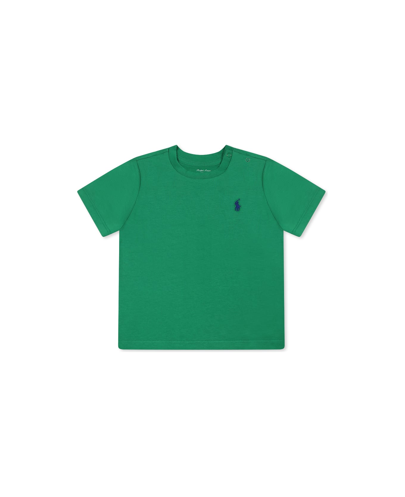 Green cotton t-shirt, short sleeves, with ribbed crew neck and snap button fastening on the shoulders. It is embellished with iconic blue pony embroidered on the chest.