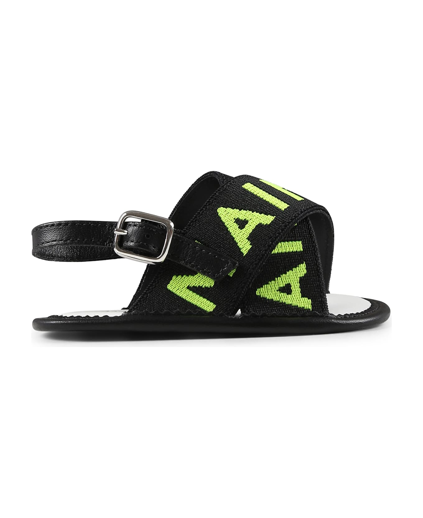 Black sandals with strap on the heel, buckle and crossed bands on the front. They are embellished with a neon yellow logo.