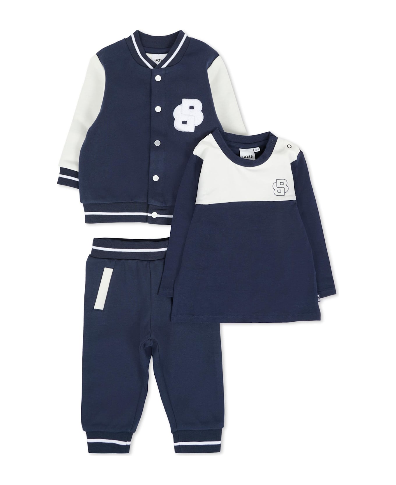 Blue cotton suit composed of a bomber jacket, t-shirt and trousers. The bomber jacket features long, contrasting white sleeves, a low collar, a snap-button front, and ribbed cuffs and hem. It is embellishted with a sponge BB logo on the chest. The long-sleeved T-shirt features a ribbed crew neck and snap-button closure on the shoulder. It is embellished with a logo print on the chest. Trousers feature an elastic waistband and ribbed cuffs.