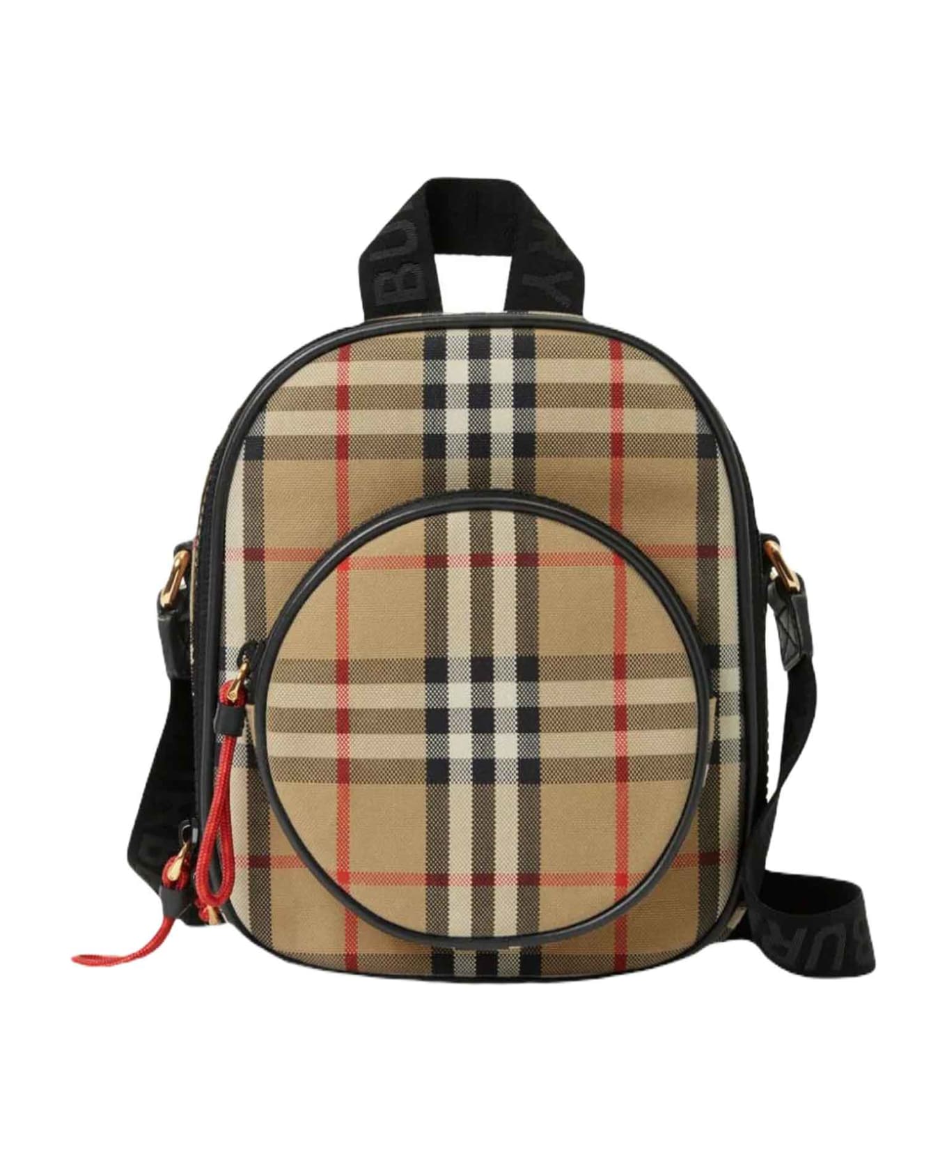 Beige bag unisex. Vintage check pattern, single top handle, adjustable shoulder straps, exterior zipper pocket, interior slip pocket, top zipper closure, gold-tone hardware. 100% Cotton