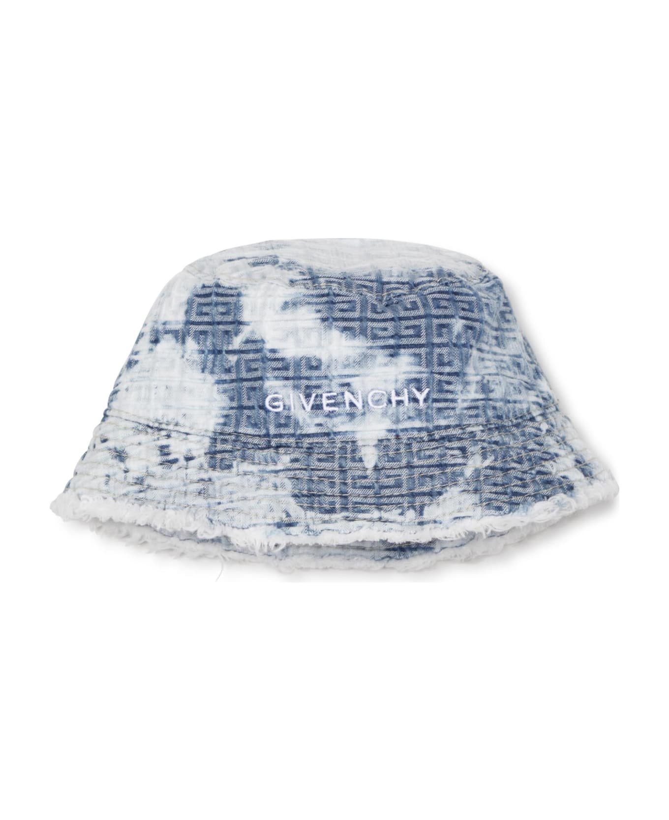 tie-dye logo-embroidered bucket hat from Givenchy Kids featuring blue/white, cotton, tie-dye pattern, monogram pattern, embroidered logo to the front, frayed detailing and dropped narrow brim.