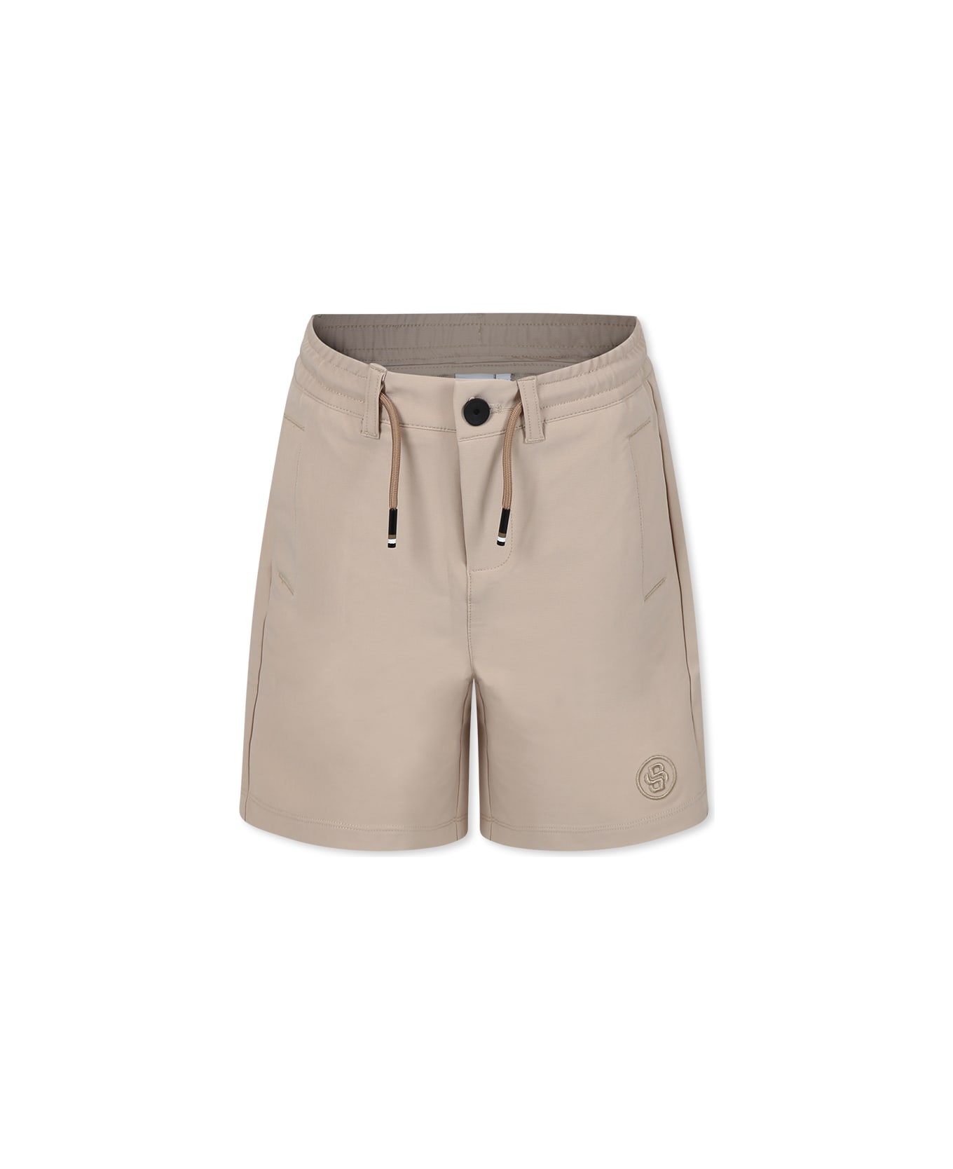 Beige shorts with belt loops, elasticated waist, front zip and button fastening, side pockets and hidden zip pocket on the back. They are embellished with an embroidered logo on one leg.