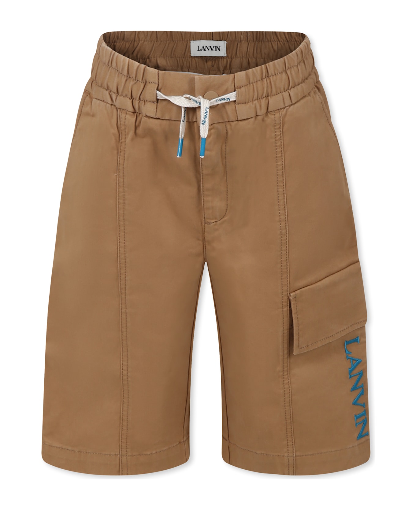 Beige shorts with elasticated waist, drawstring, zip and button on the front, side pockets and pockets on the back. They are embellished with an embroidered logo on the leg and a Curb motif detail on the back.