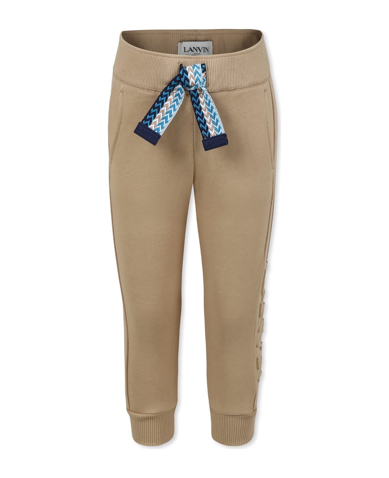 Beige trousers in brushed organic cotton, with elasticated waist, Curb motif detail on the front, side pockets, zip pocket on the back and ribbed ankles. They are embellished with an embossed logo on the leg.