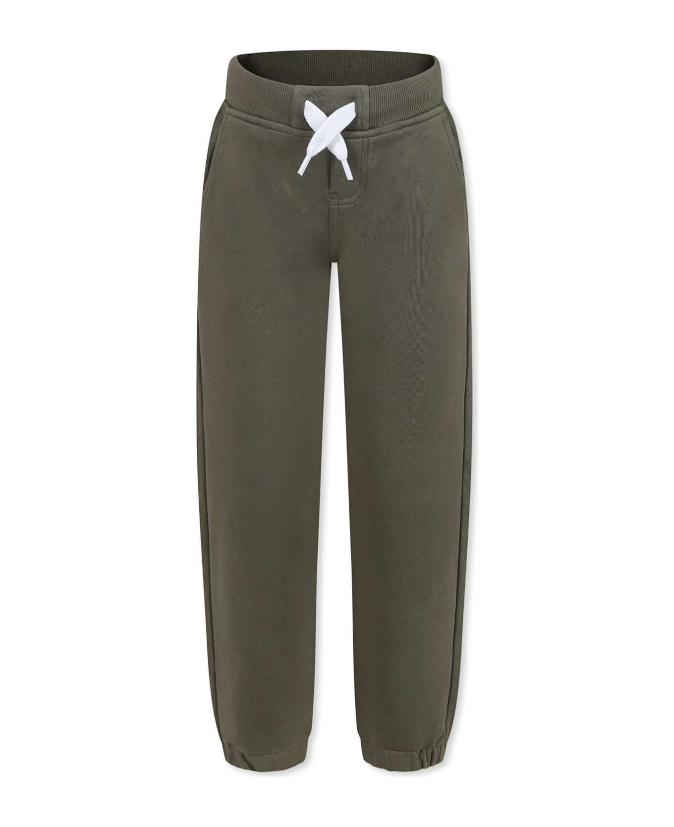 Green brushed trousers, in organic cotton blend, with elasticated waist, drawstring, side pockets, back pockets and elasticated ankles. They are embellished with a logo patch on the back.