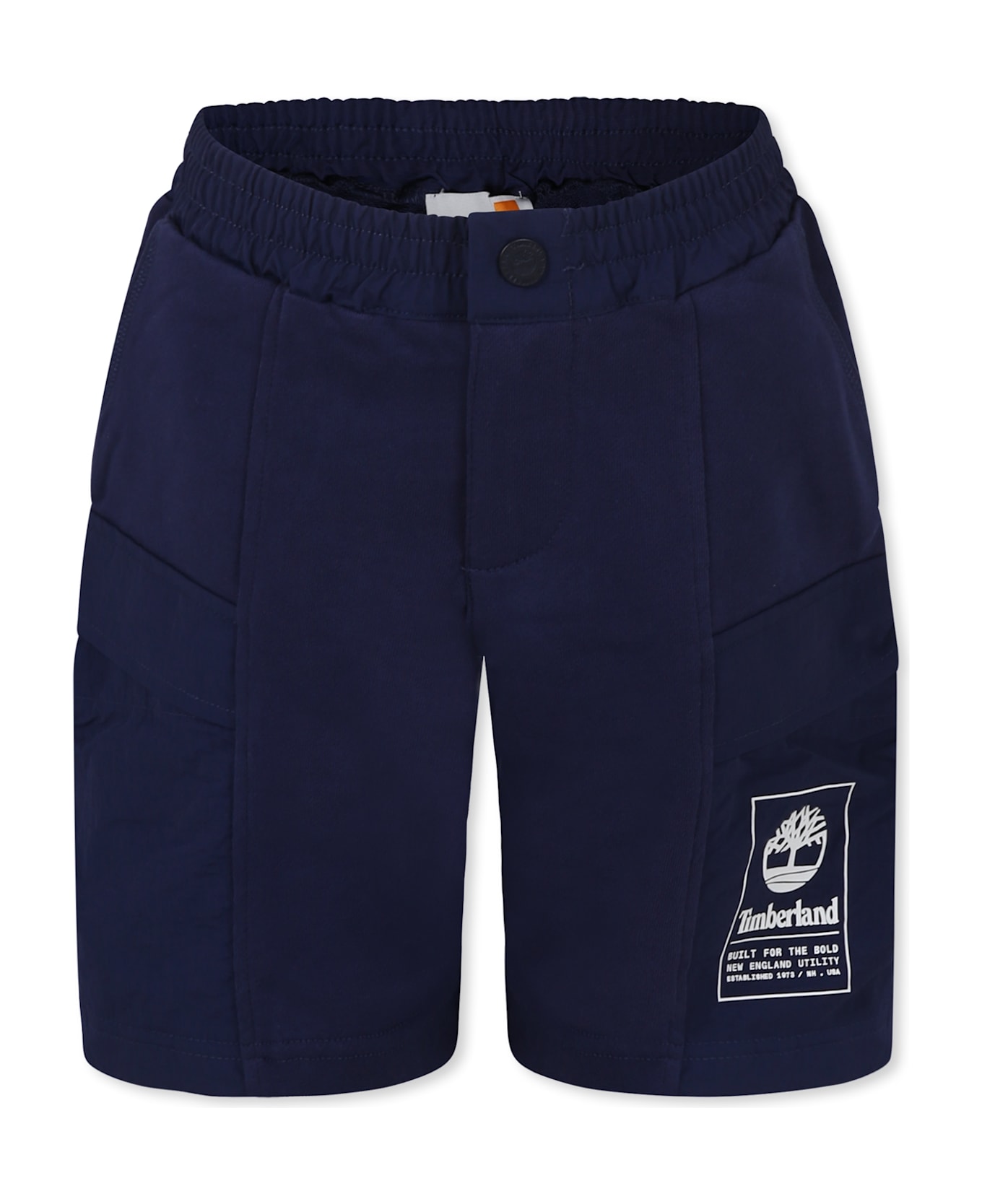 Blue cotton blend shorts, brushed, with front zip and snap button fastening, elasticated waist, side pockets and cargo pockets on the sides. They are embellished with logo and tree on one side.