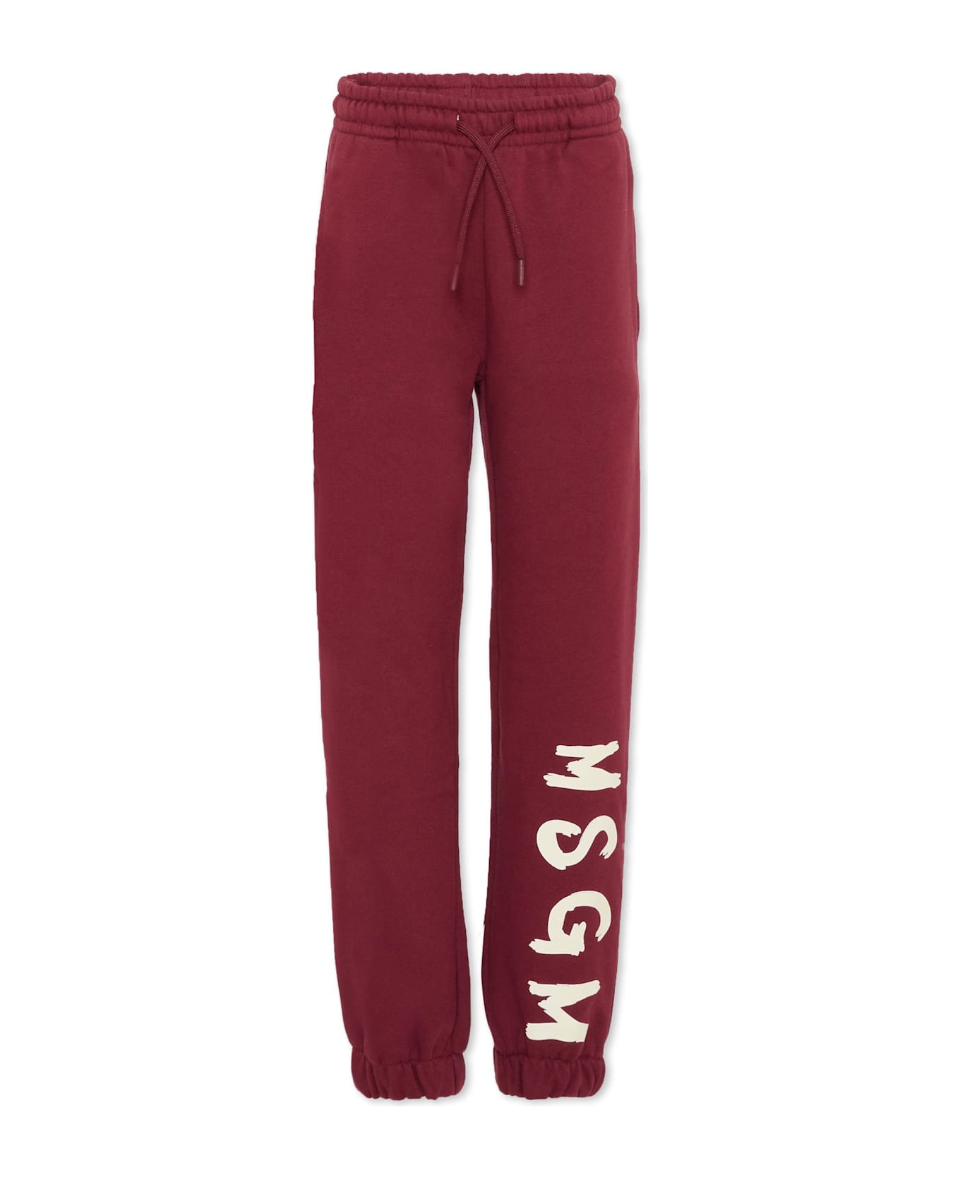 Burgundy trousers in cotton fleece, with elasticated waist, drawstring, side pockets, patch pocket on the back and elasticated ankles. They are embellished with a ivory logo on one leg.