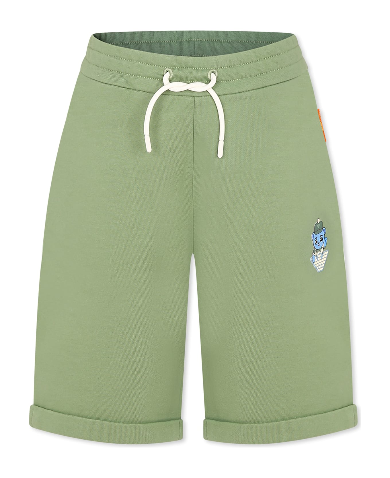 Green shorts in brushed organic cotton, with elastic waist, drawstring, side pockets and cuffed hems. They are embellished with Manga Bear print on one leg and logo patch on one side. The garment is part of the new Manga Bear Crew capsule, an SS25 proposal that features the iconic Manga Bear by Emporio Armani in a golfer version: colorful and lively graphics tell the world of golf clubs in a fun way.
