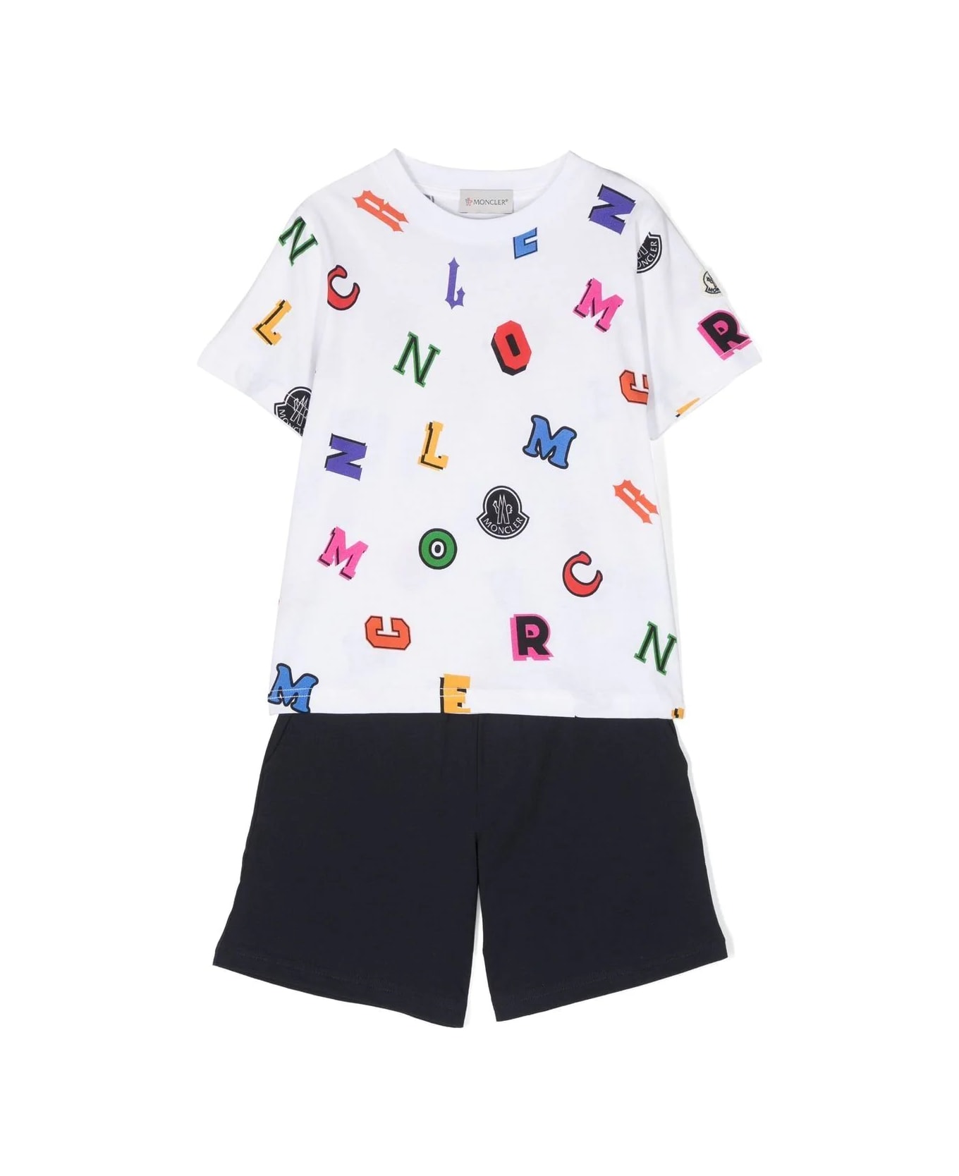 The Moncler Enfant set is made of stretch jersey and consists of a pair of navy blue sports shorts with pockets and a white T-shirt with crew neck, short sleeves and a colourful all-over print.