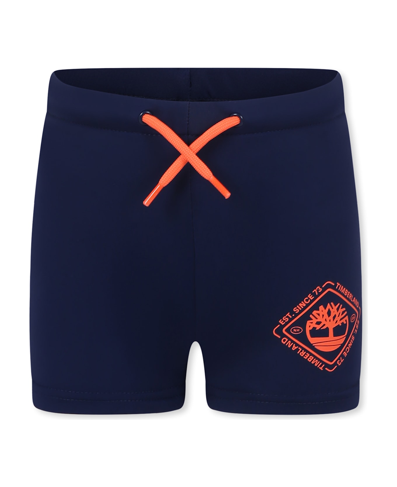 Blue swim shorts with elasticated waist and drawstring. It is embellished with a tree and logo on the leg.
