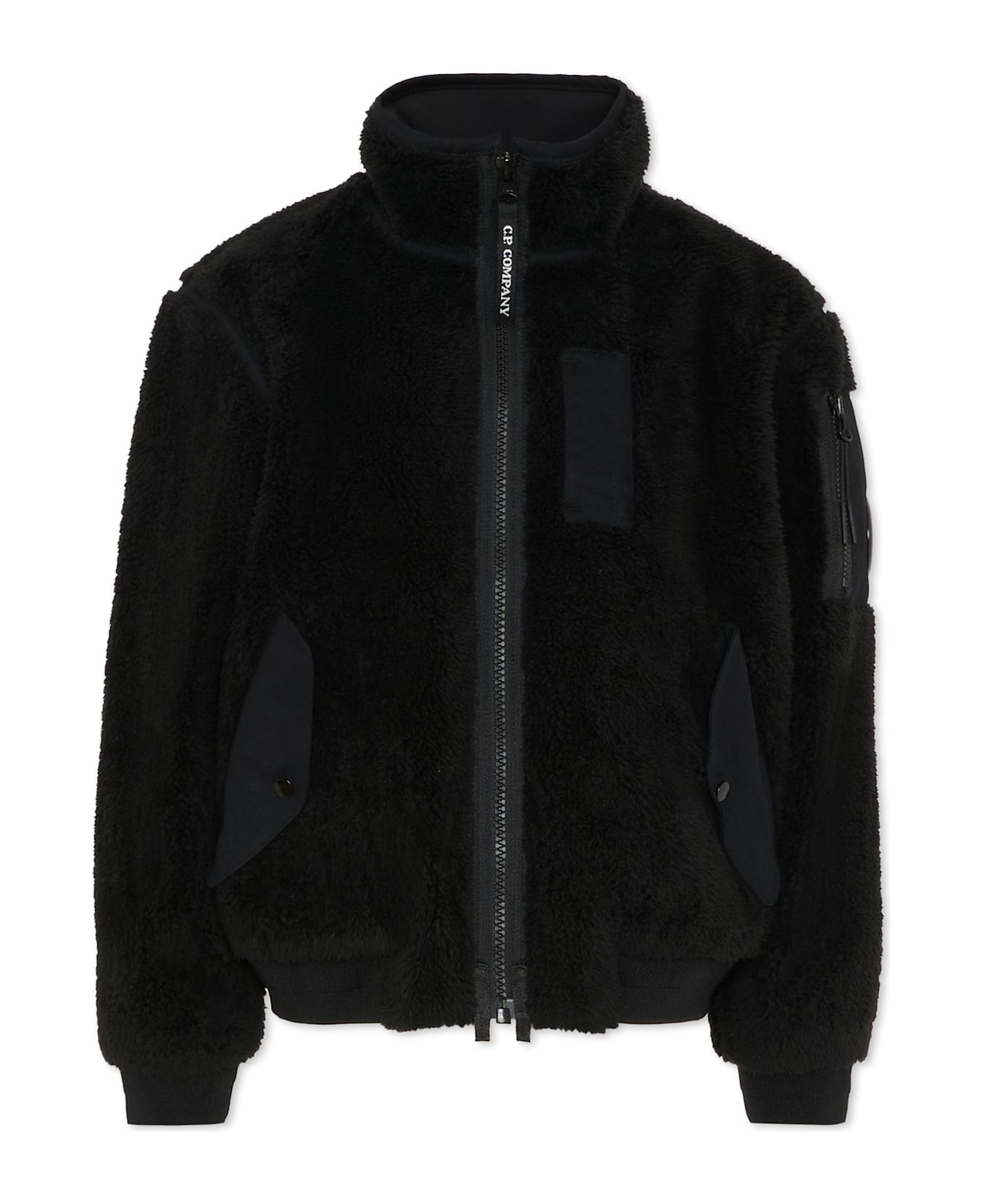 Black faux fur teddy coat with long sleeves, a crew neck, a front zip fastening, side snap pockets, a zip pocket on one sleeve, and ribbed cuffs and hem. It is embellished with a lens applied on one sleeve.