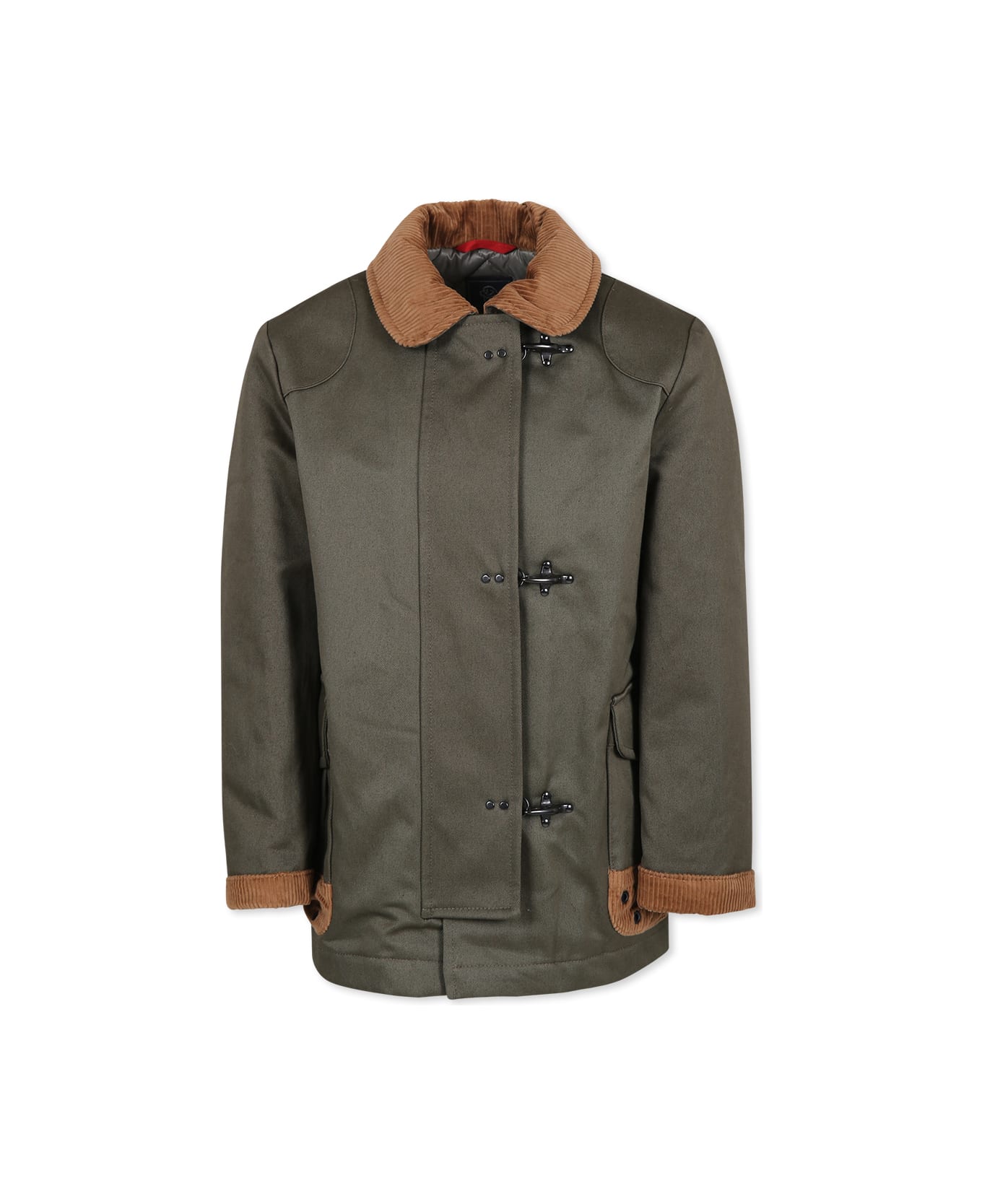 Green long-sleeved jacket with quilted and padded interior. With brown ribbed collar and cuffs; hook-and-eye and snap-button closure; snap-button pockets on front.