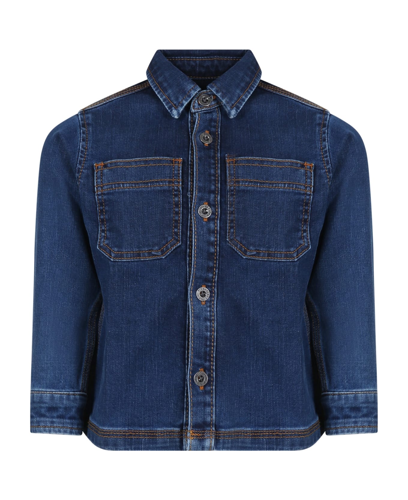 Denim blue shirt, long sleeves, with collar, front button closure, pockets on the chest. It is embellished with iconic shoe applied on the side and logo on one sleeve.