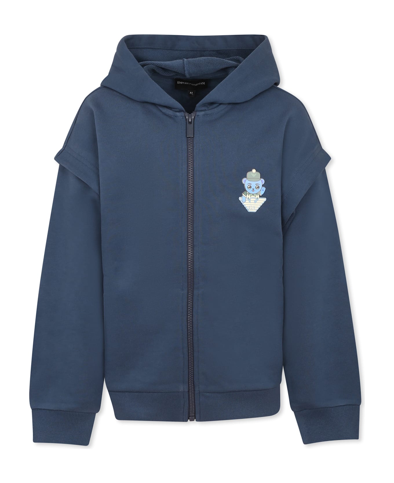 Blue sweatshirt in brushed organic cotton, long sleeves, with hood, front zip closure, side pockets, ribbed cuffs and hem. It is embellished with Manga Bear print and logo on the back and front. The item is part of the new Manga Bear Crew capsule, a SS25 proposal that features the iconic Manga Bear by Emporio Armani in a golfer version: colorful and lively graphics tell the world of the golf club in a fun way.
