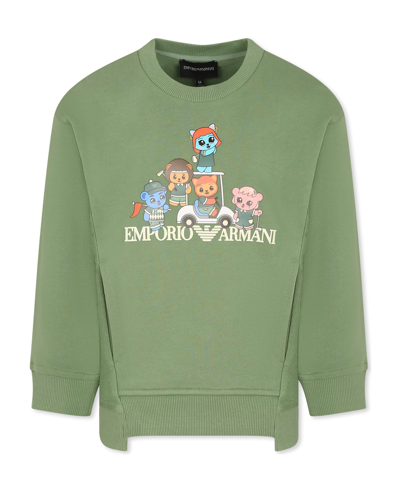 Green sweatshirt in brushed organic cotton, long sleeves, with crew neck, ribbed cuffs and hem and side pockets. It is embellished with Manga Bear Crew print and logo on the front. The item is part of the new Manga Bear Crew capsule, an SS25 proposal that features the iconic Manga Bear by Emporio Armani in a golfer version: colorful and lively graphics tell the world of golf clubs in a fun way.