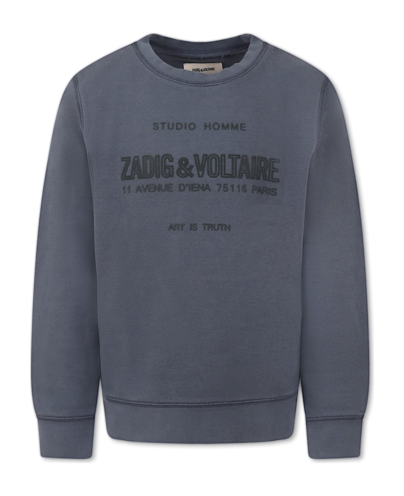 Blueish grey gauzed cotton sweatshirt with long sleeves, crew neck, ribbed hem and cuffs. It is embellshed with a black logo on the front.