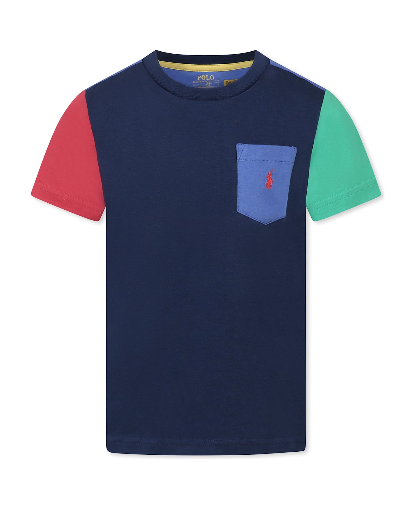 Blue cotton t-shirt, color block design, short sleeves, ribbed crew neck and chest pocket. It is embellished with iconic red horse embroidered on the chest.