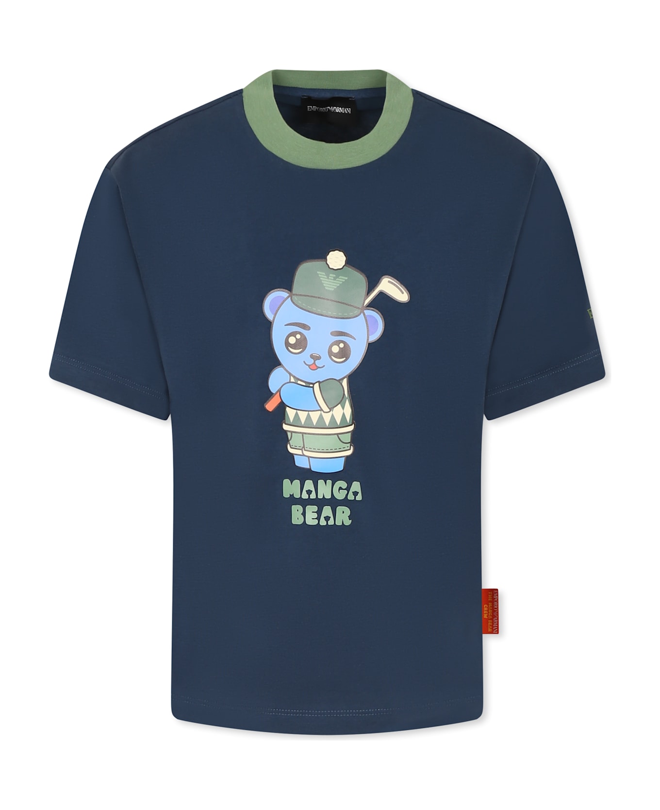Blue organic cotton t-shirt, with short sleeves and a green ribbed crew neck. It is embellished with a Manga Bear print on the front, a logo on the sleeve and a logo patch on one side. The item is part of the new Manga Bear Crew capsule, an SS25 proposal featuring the iconic Manga Bear by Emporio Armani in a golfer version: colorful and lively graphics tell the world of the golf club in a fun way.