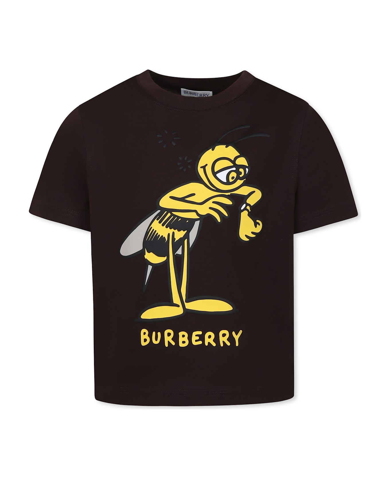 Brown t-shirt from the luxury brand Burberry Kids, made of cotton, with short sleeves and a ribbed crew neck. It is embellished with logo and bee print on the front.