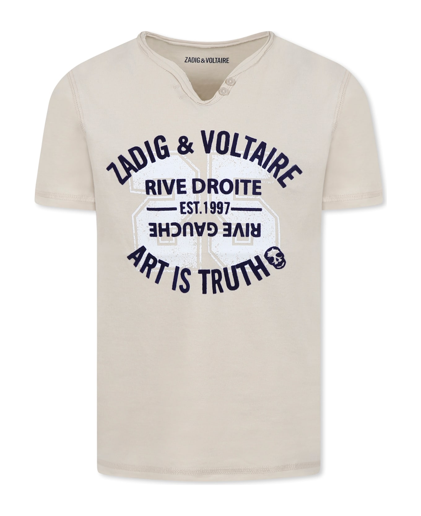 Ivory cotton t-shirt, with short sleeves and a V-neck. It is embellished with a blue logo and writing on the front and with embroidery on the sleeve.