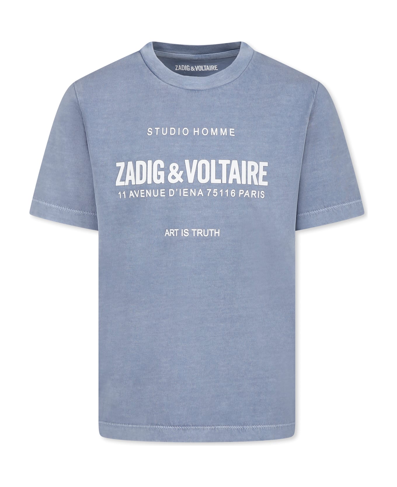 Light blue cotton t-shirt, with short sleeves and ribbed crew neck. It is embellished with white logo and writing on the front.