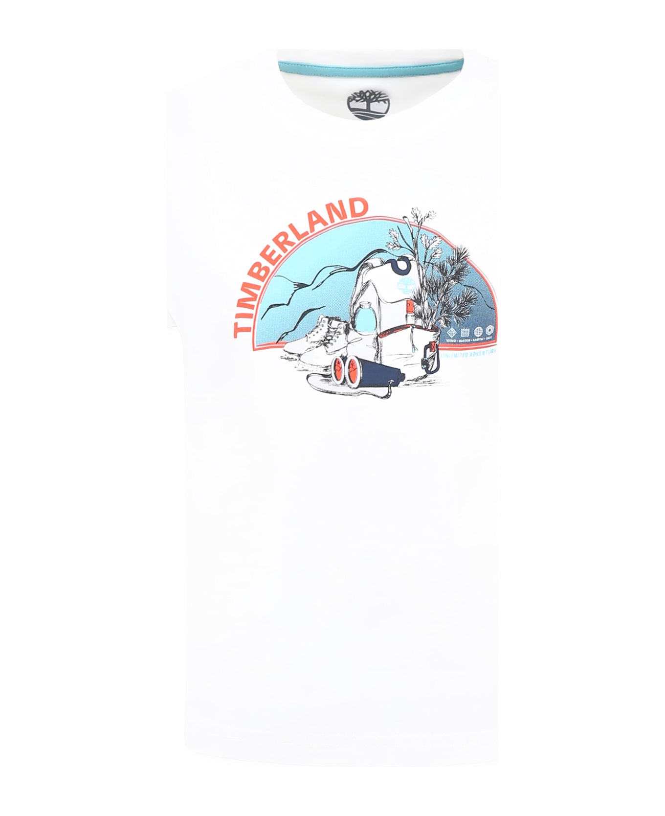 White organic cotton t-shirt with short sleeves and ribbed crew neck. It is embellished with logo and backpack print on the front.