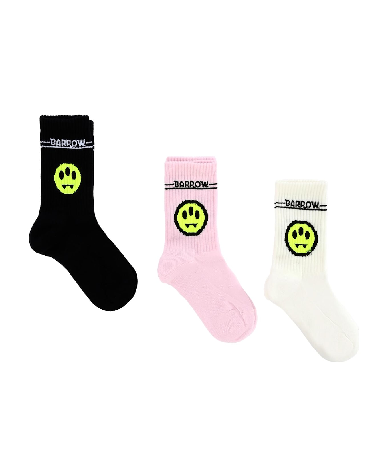 Multicolor terry socks set, cmposed of three pairs of socks, pink, white and black, with ribbed leg; they are embellished with the iconic yellow smiley and logo on the sides.