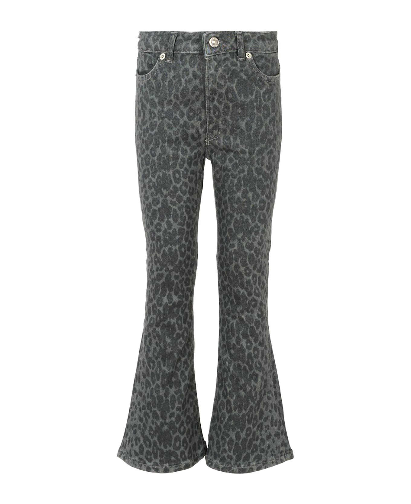 Black five-pocket, flared jeans with belt loops, a front zip and button closure, and an adjustable waistband with an internal buttoned elastic. They are embellished with an all-over animal print and a logo patch on the back.