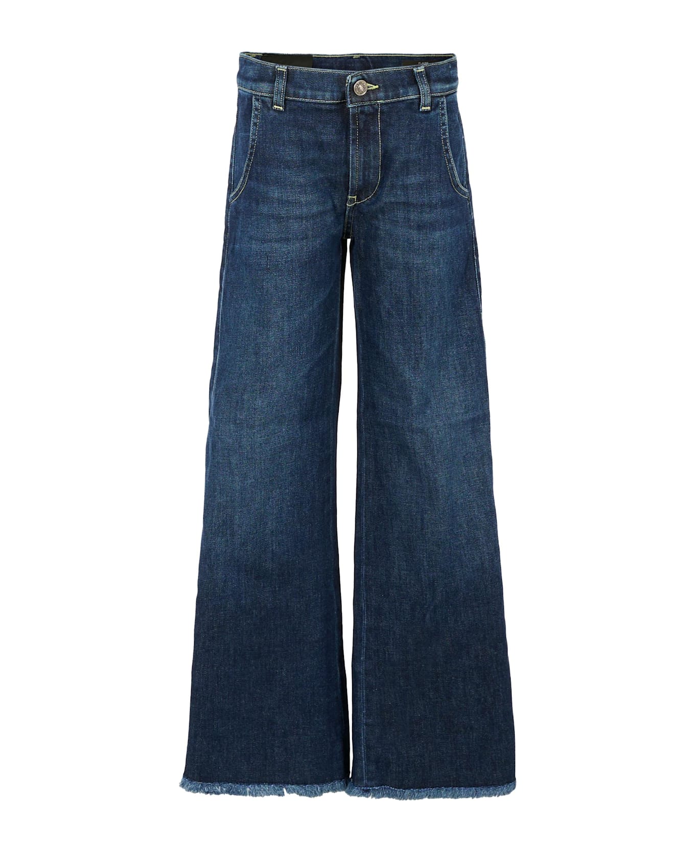 Blue denim jeans made of cotton, with an adjustable waist thanks to internal buttoned elastic bands, belt loops, button and zipper closure on the front, front and back pockets. They are embellished with logo patch on the back and frayed hem. The special treatment performed by hand on each individual garment makes it unique and different from all others. Variations in tone and/or abrasion details are typical features of these particular treatments. Made in Italy.