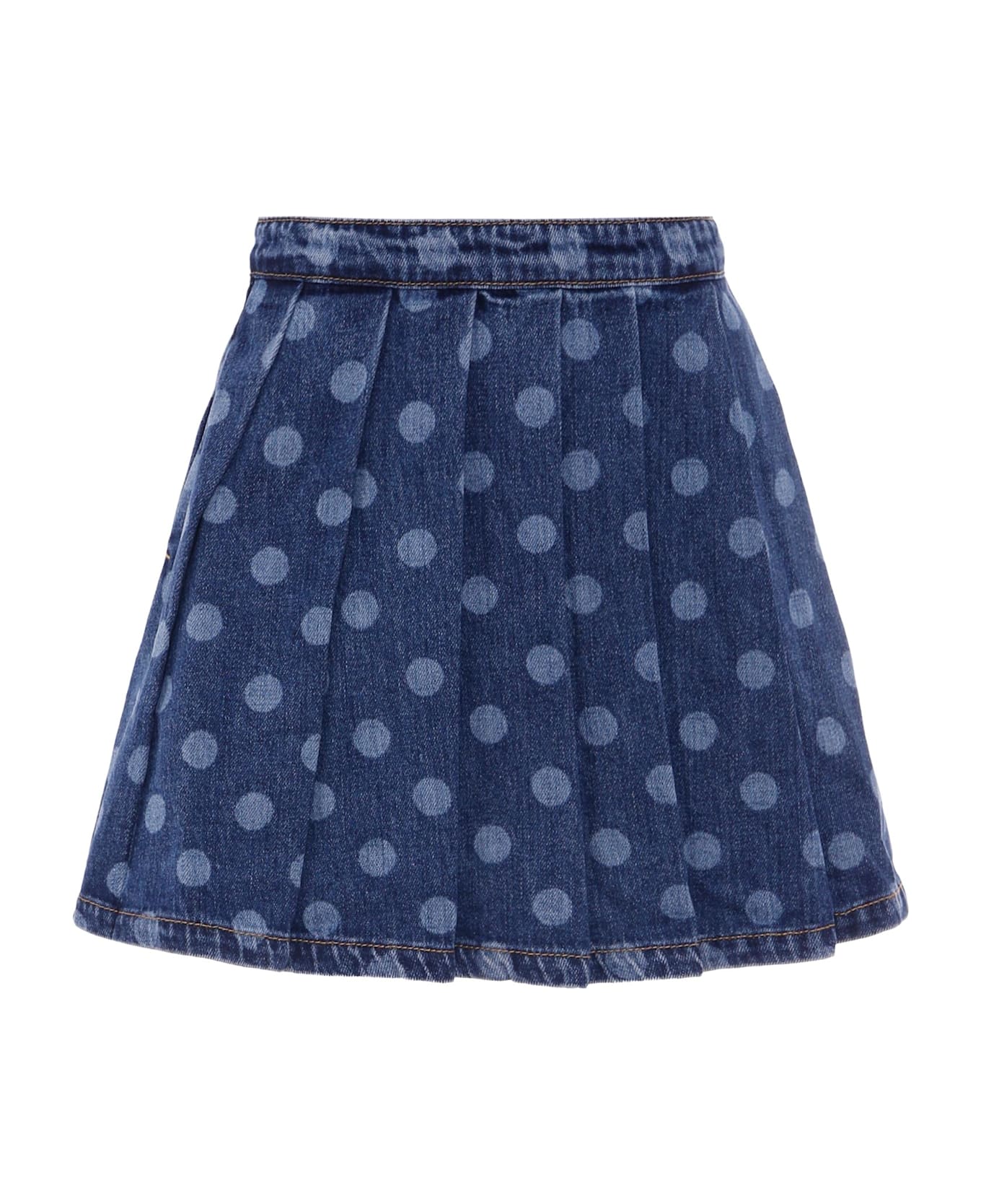 Pleated denim skirt, with side pockets and zip fastening on the back. It is decorated with all-over polka dots.