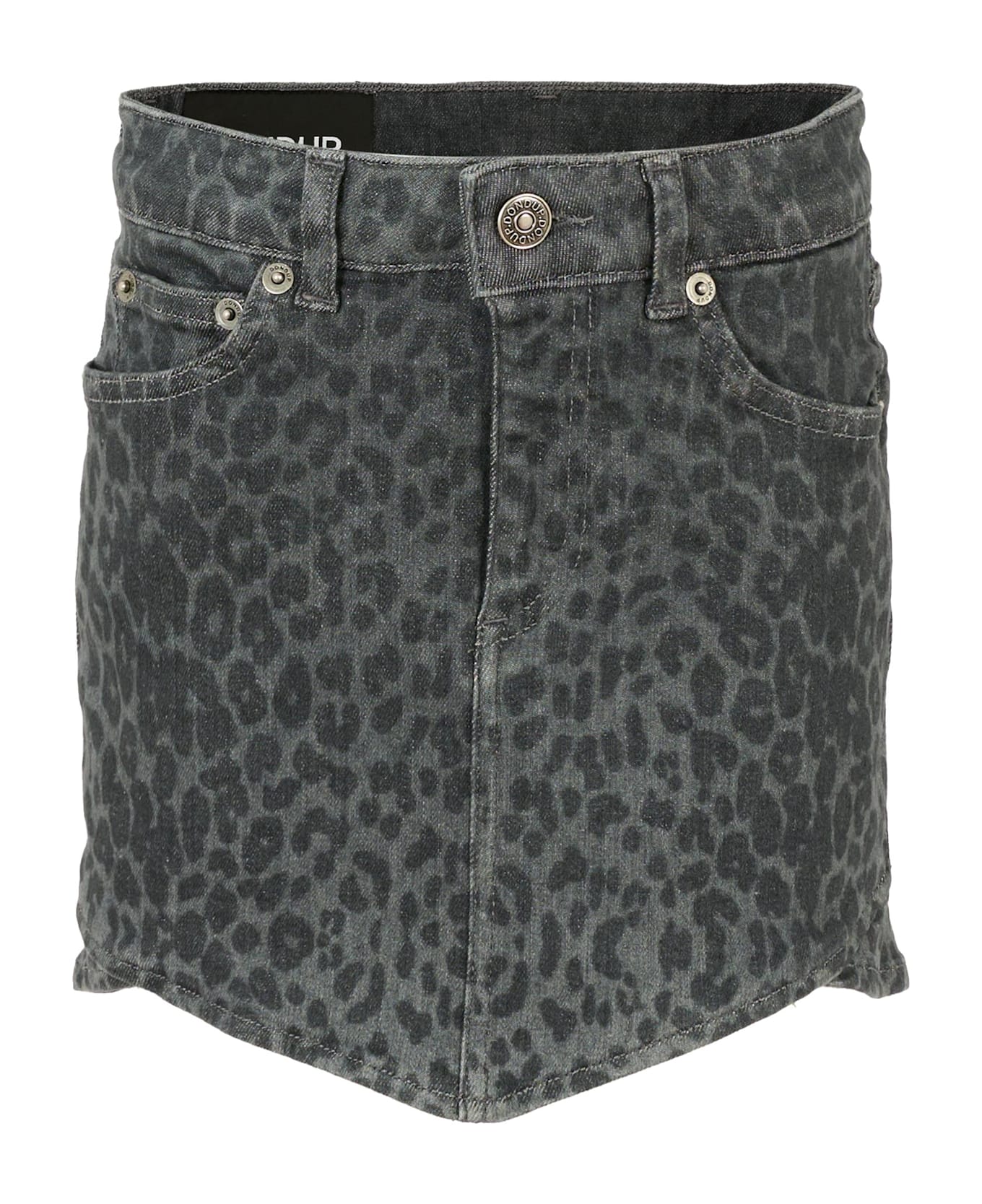 Gray denim skirt with five pockets, adjustable waist thanks to internal buttoned elastics, belt loops, button and zipper closure on the front. It is embellished with all-over spotted print and logo patch on the back.