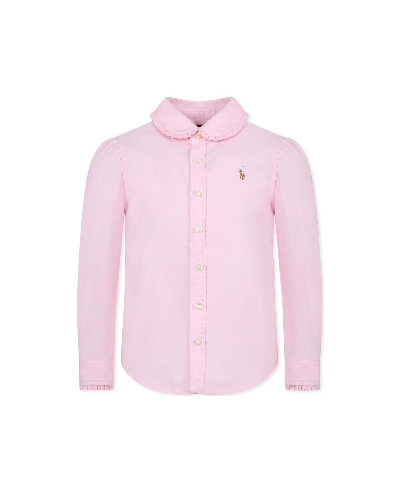 Pink, heavy cotton shirt with long sleeves, a pointed collar, a front button closure, and ruffled details. Small sizes feature a rounded collar. It's embellished with an iconic embroidered pony on the chest. È decorata con iconico cavallino ricamato sul petto.
