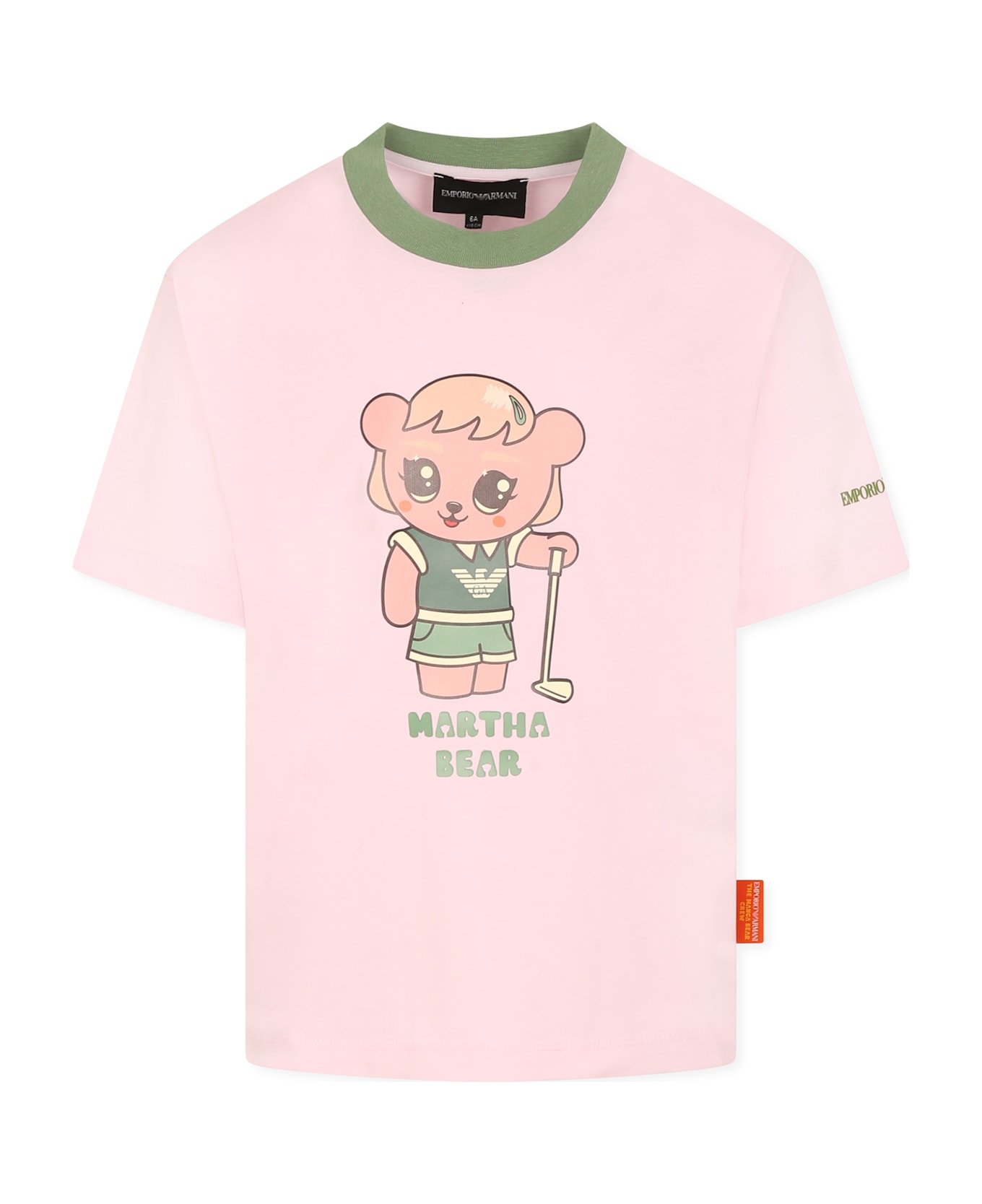 Pink organic cotton t-shirt, with short sleeves and a green ribbed crew neck. It is embellished with a Manga Bear print on the front, a logo on the sleeve and a logo patch on one side. The item is part of the new Manga Bear Crew capsule, an SS25 proposal featuring the iconic Manga Bear by Emporio Armani in a golfer version: colorful and lively graphics tell the world of the golf club in a fun way.