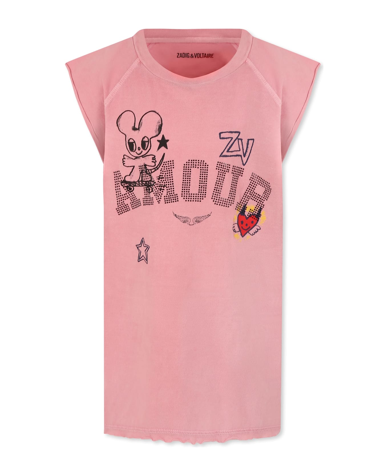Pink tank top with ribbed crew neck and hem. It is embellished with rhinestone Amour lettering, a red heart and designs on the front.