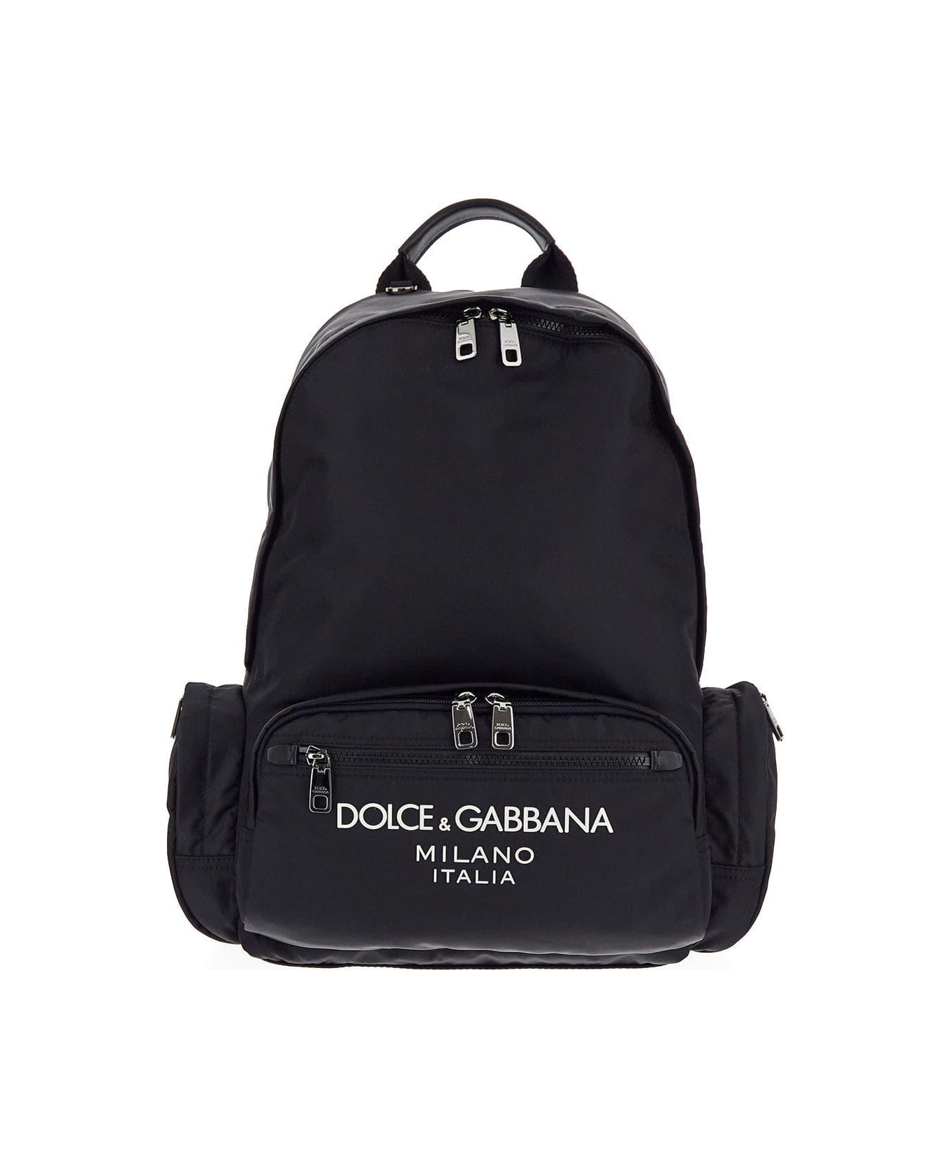 Dolce & Gabbana backpack in black nylon featuring top fastening with double zipper, logoed sliders, internal space with laptop compartment, smartphone pocket and zipped pocket, two external side pockets with black zip and double branded sliders, two frontal zipped pockets with white rubberized logo at front, top handle and adjustable tape shoulder straps with calfskin details.