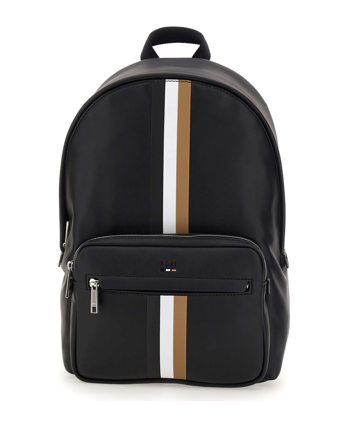 Men's by BOSS 'Ray Backpack' vegan leather backpack, black colour, external pockets with zip, adjustable padded shoulder straps, compartment with zip closure, internal pockets, shiny silver metallic finishes, front embossed logo, top handle, iconic multicolor stripes. Dimensions: height 40cm, length 29cm, depth 13cm.