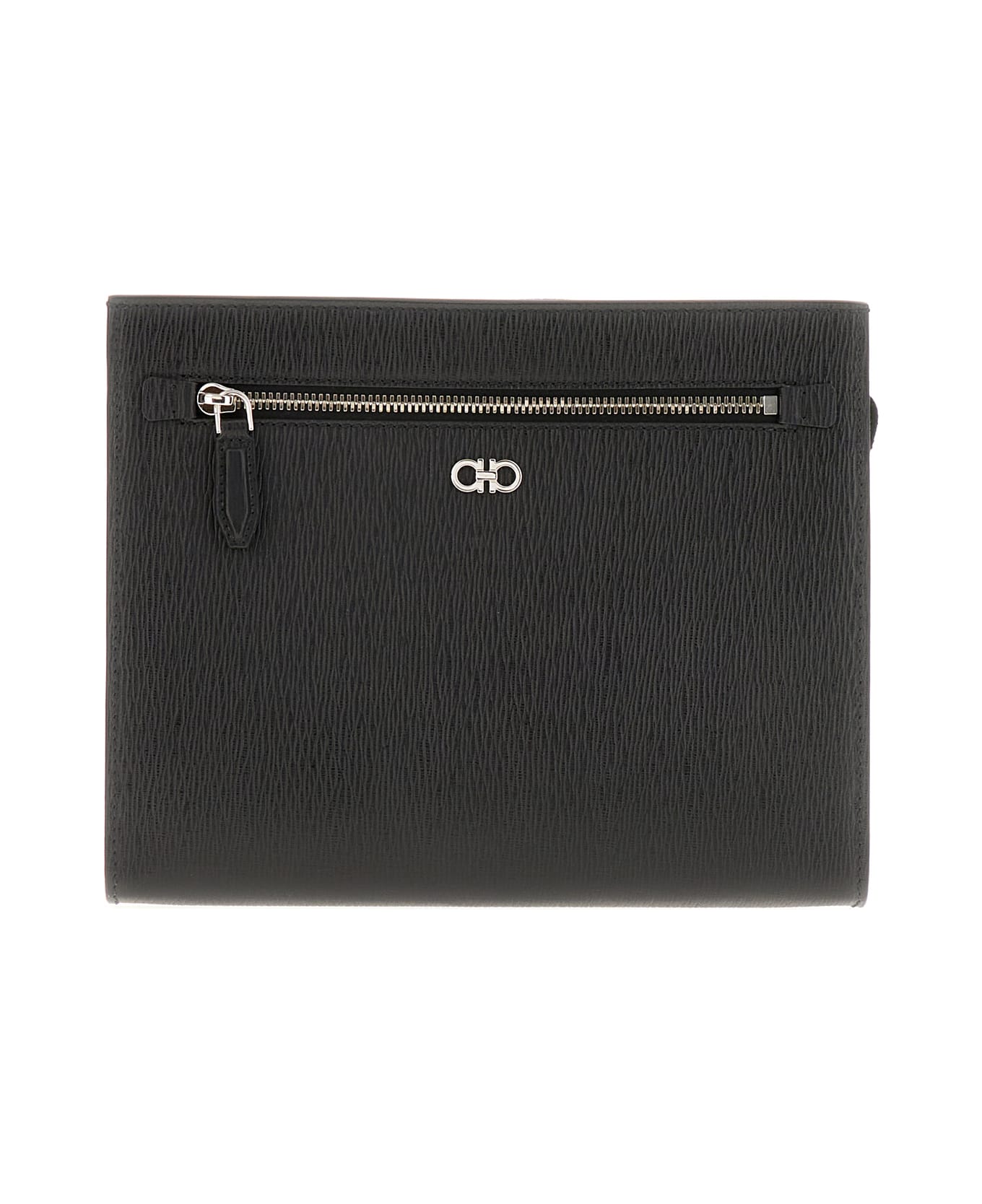Clutch realized in pebble calf leather with a metal Gancini detail at the front. -Tonal leather wrist handle -Zip closure -A zip pocket at the front -Lined interior with two patch pockets Composition: 100%CALF