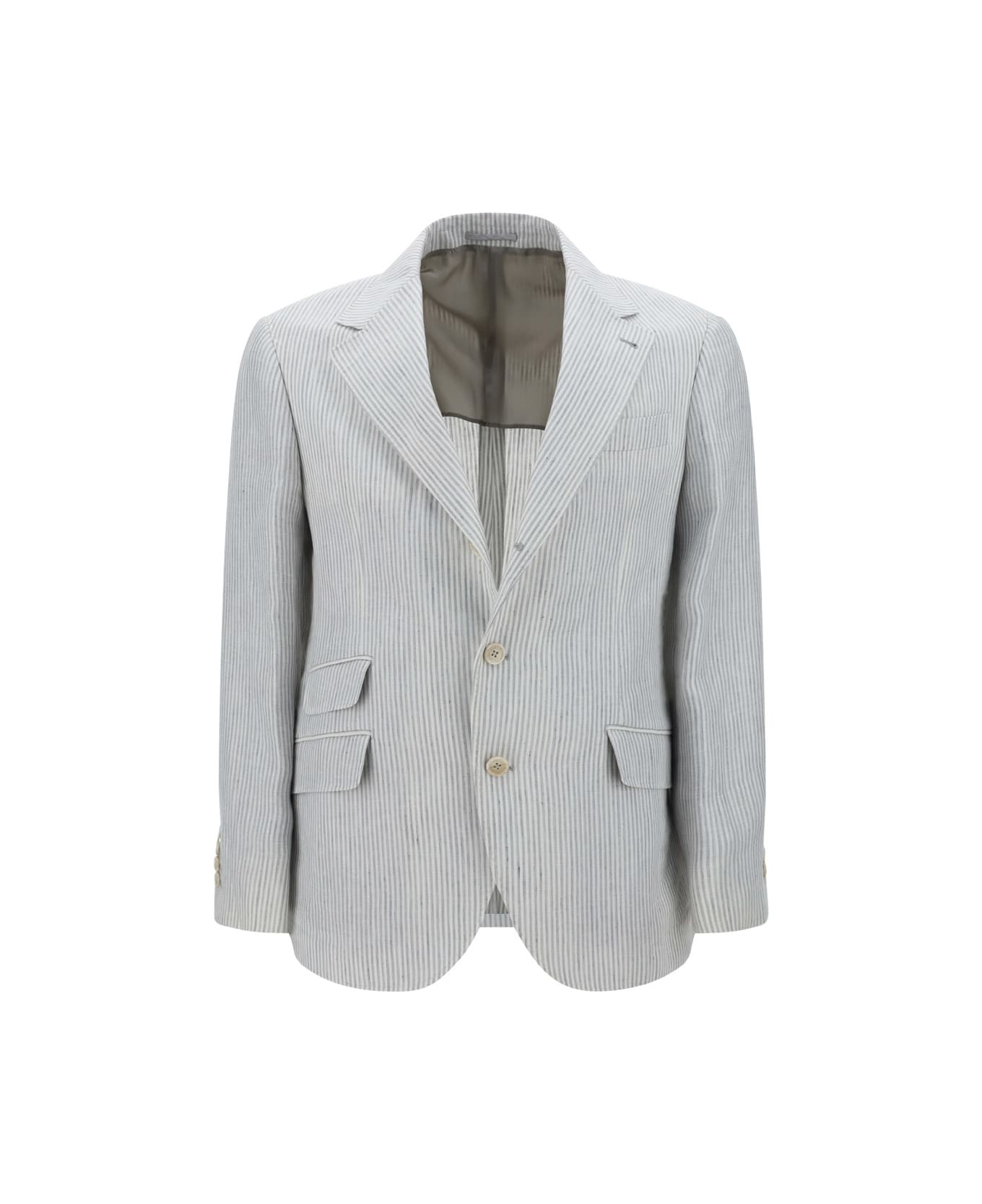 Linen blazer jacket by brunello cucinelli, a contrasting front button fastening, classic lapels, three welt pockets with side flaps, a front welt pocket, a double back vent, structured shoulders, a two-tone stripe pattern, and a regular fit.