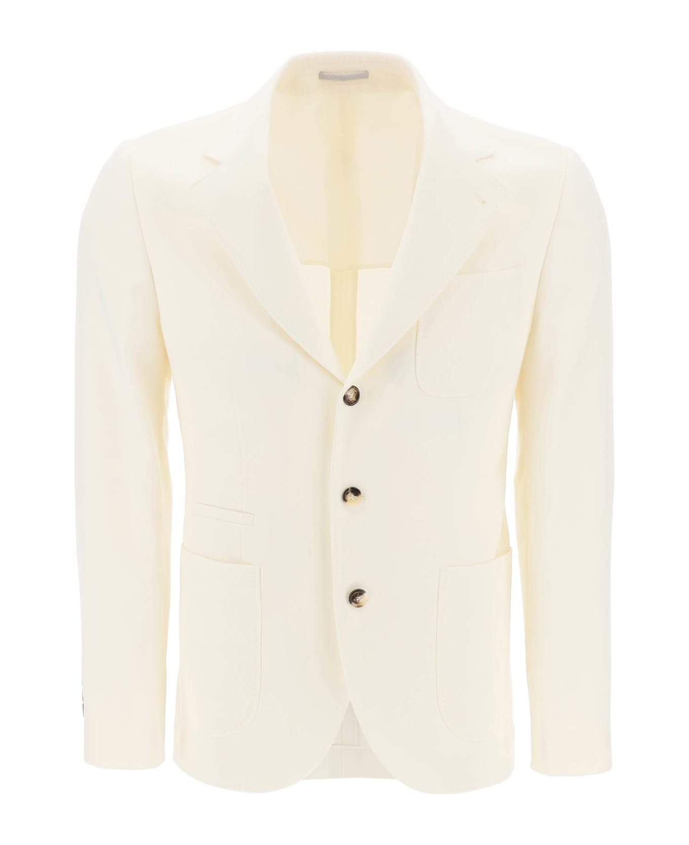 Deconstructed jacket by Brunello Cucinelli made from carded wool and silk twill with single-breasted design and three-button closure. It features notch lapel, patch pockets, welt ticket pocket and back side vents. Partially lined and provided with internal pockets. Slim fit with the iconic Solomeo Shoulder. The model is 187 cm tall and wears size IT 46.
