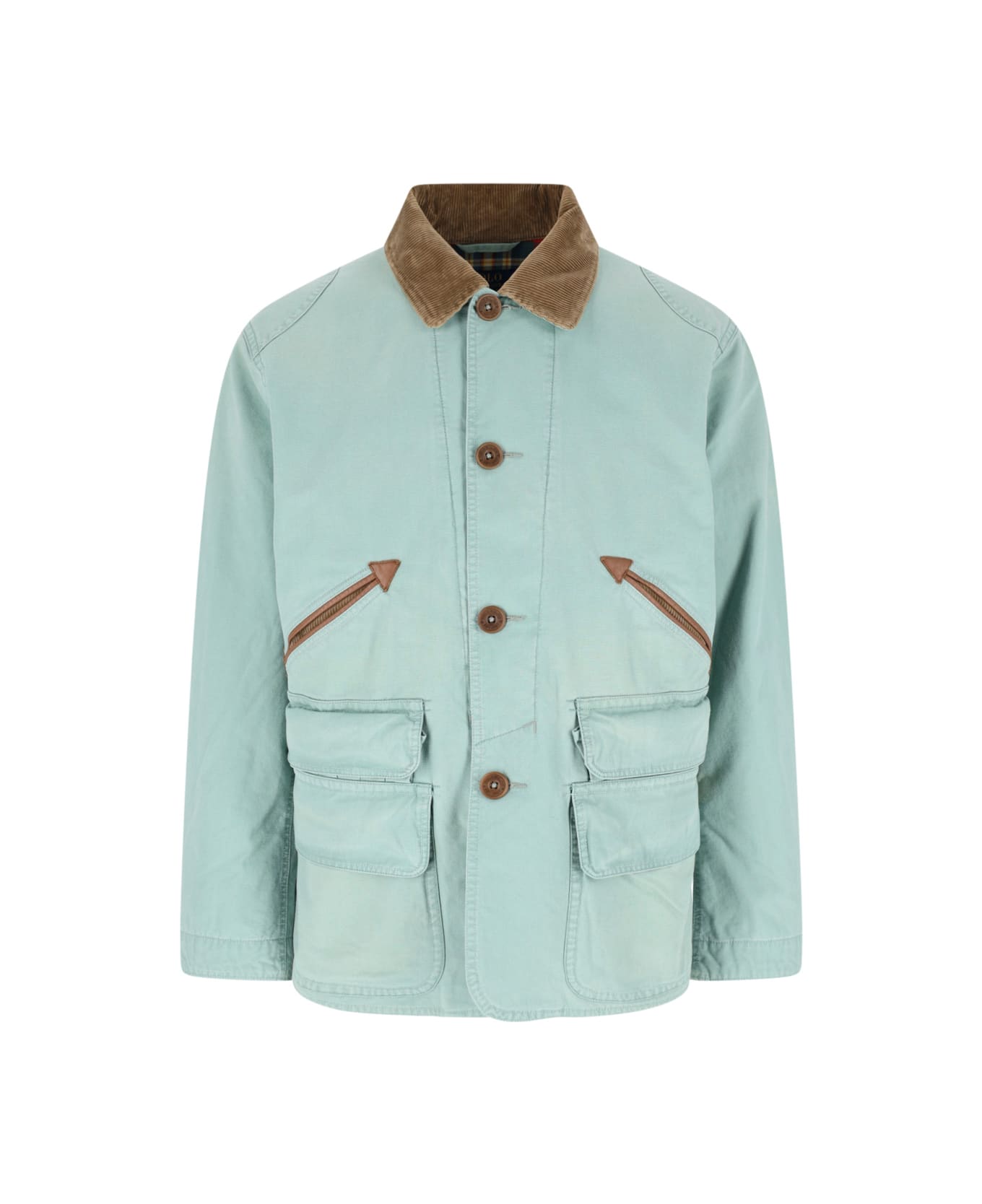 Polo Ralph Lauren military jacket in mint shades, classic corduroy collar, button closure, two pockets with contrasting leather trim detail, four front patch pockets, button cuffs, straight hem.