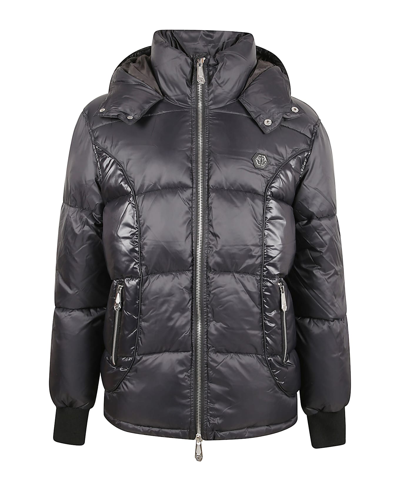 Quilted and padded nylon fabric Hood Matching piping Logo patch sewn on the left chest Ribbed cuffs Zip fastening Two zipped welt pockets Lined interior