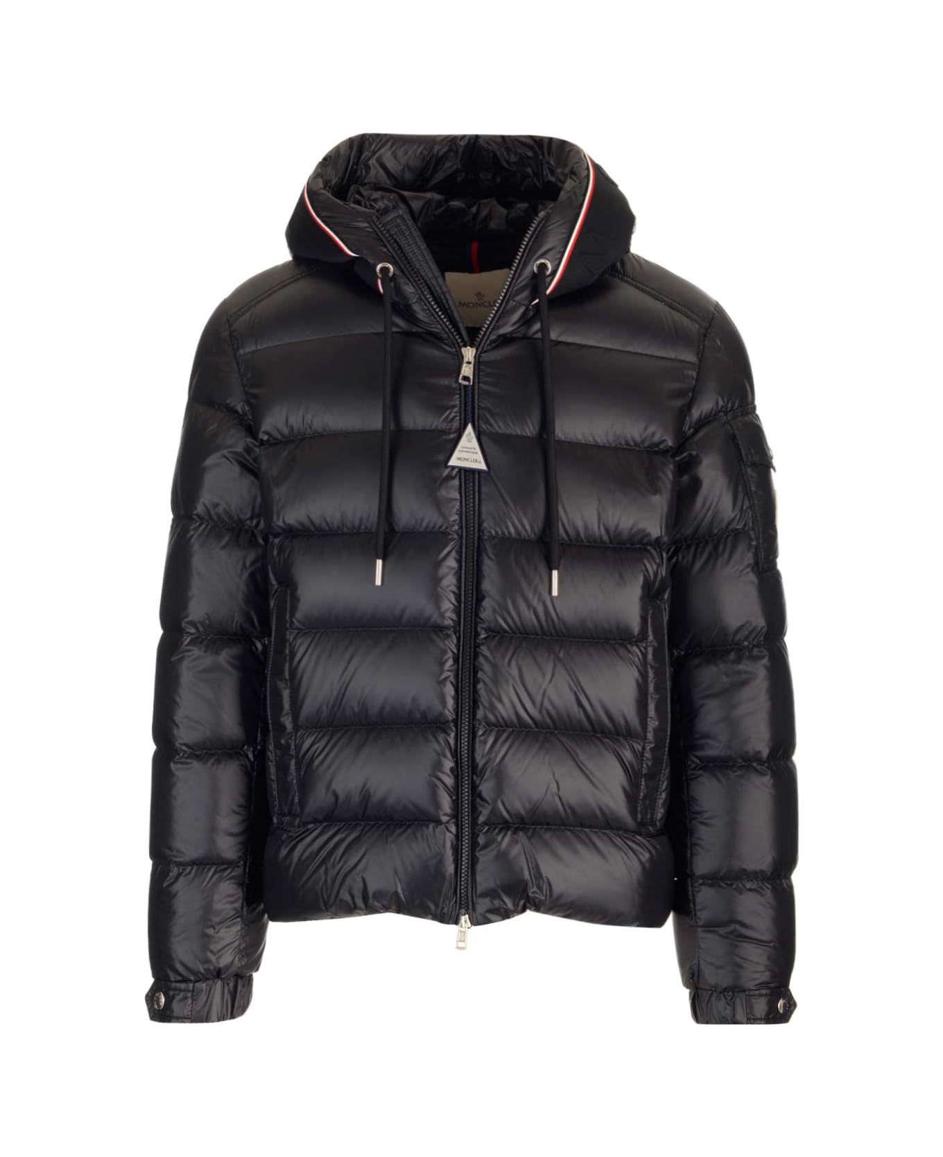 Black longue saison 'Pavin' short down jacket with feather padding by Moncler with tricolor trimmed hood, zip closure, zip pockets and snap button cuffs.
