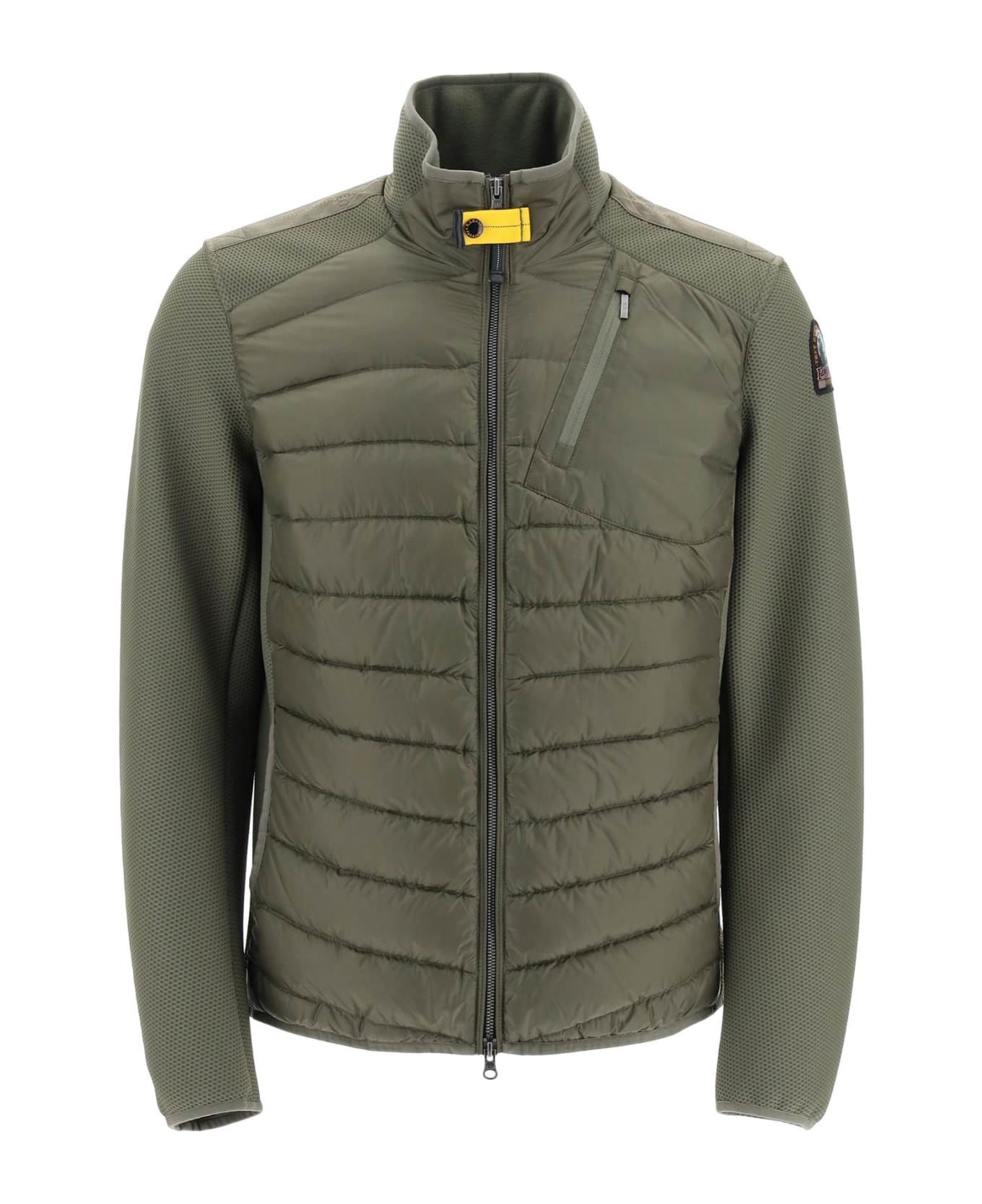 Parajumpers hybrid jacket in quilted nylon taffeta with lightweight 100% duck down padding, enriched by fleece-lined stretch honeycomb technical jersey sleeves and inserts. It sports signature yellow elastic tab at the neck and logo patch on the sleeve, and is provided with practical pockets at sides, chest and back and two large internal pockets. Double-slider zip closure, slim fit. The model is 187 cm tall and wears a size L.