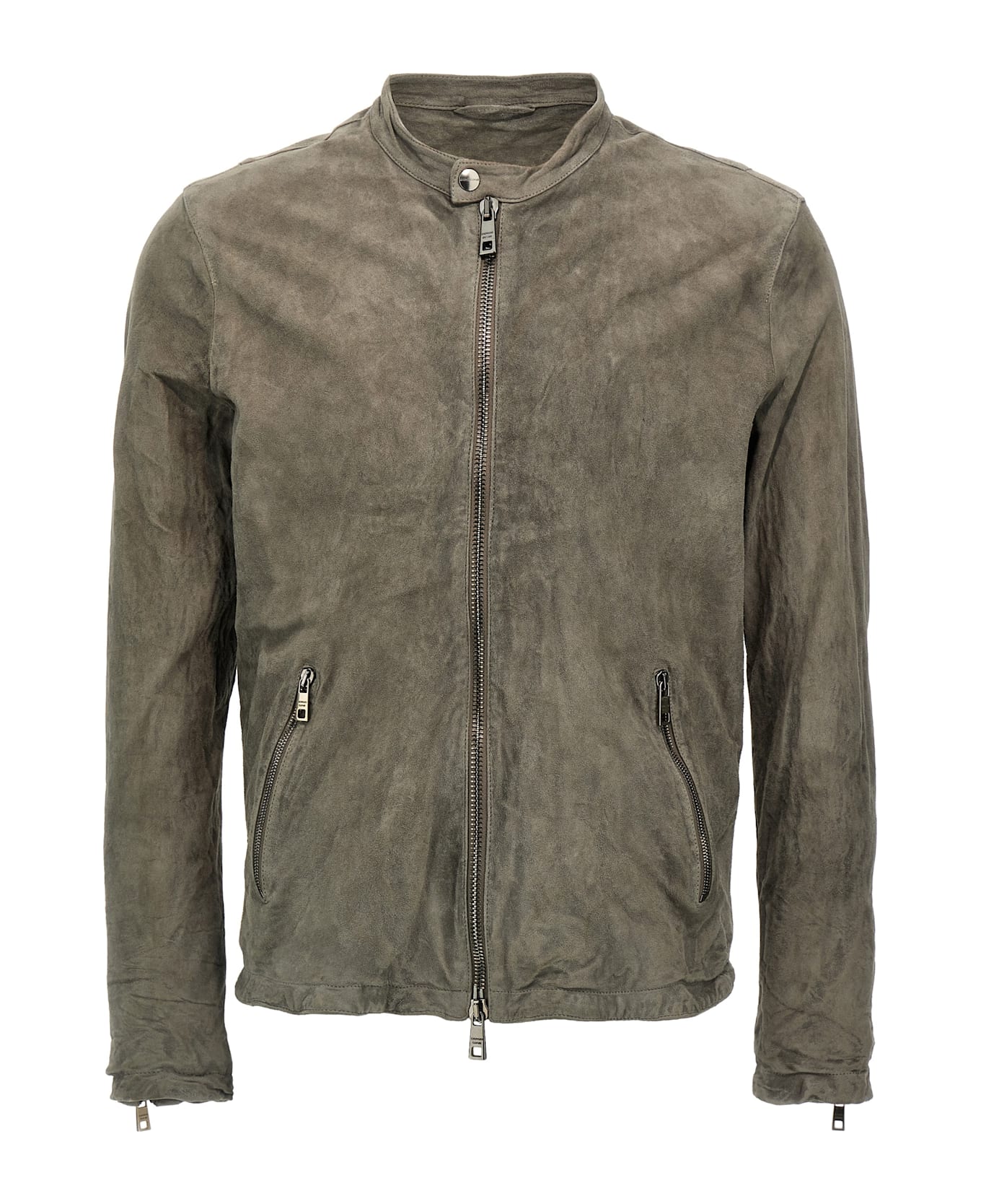 Vegetable-tanned suede jacket with zip closure, zip pockets, crew neck with snap button, long sleeves with zip on the bottom.