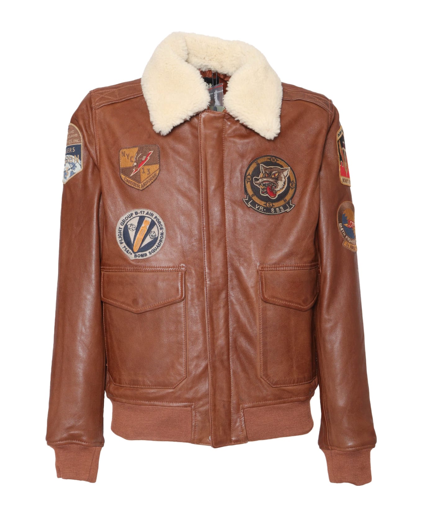 Lambskin bomber jacket, shearling collar, hidden fastening, applied patches, patch pockets with flap, knitted edges