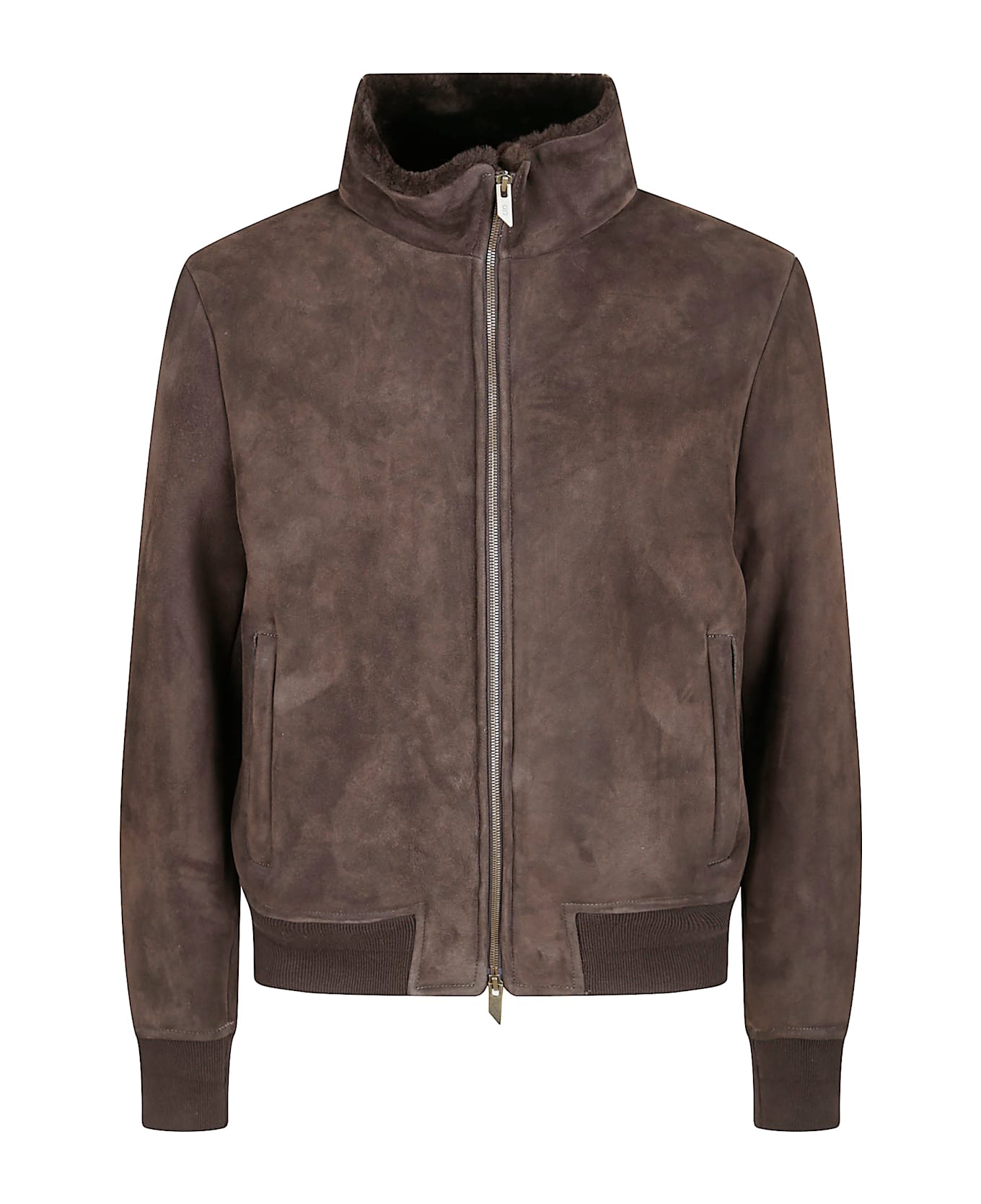Brown jacket Zip closure High collar Ribbed hem Ribbed cuffs Side pockets