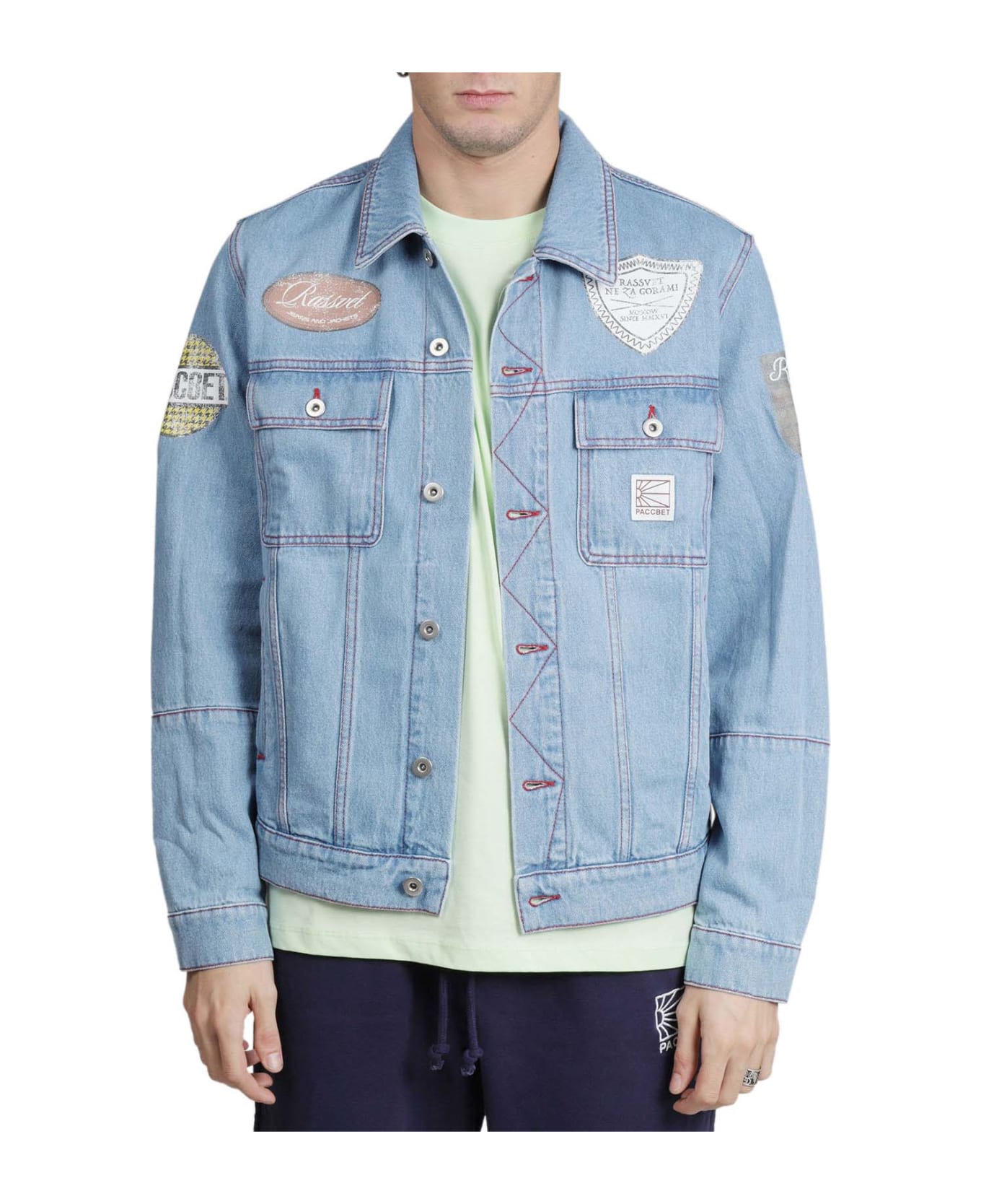 Light blue cotton denim jacket. Frontal button fastening. Long sleeves. Buttoned cuffs. Two frontal flap pockets with button closure. Two side pockets. Contrasting stitching. Point collar. Logo patches printed on front and sleeves. The model is 185cm and wears size medium. 100% cotton. Made in Italy. Designer colour: LIGHT BLUE