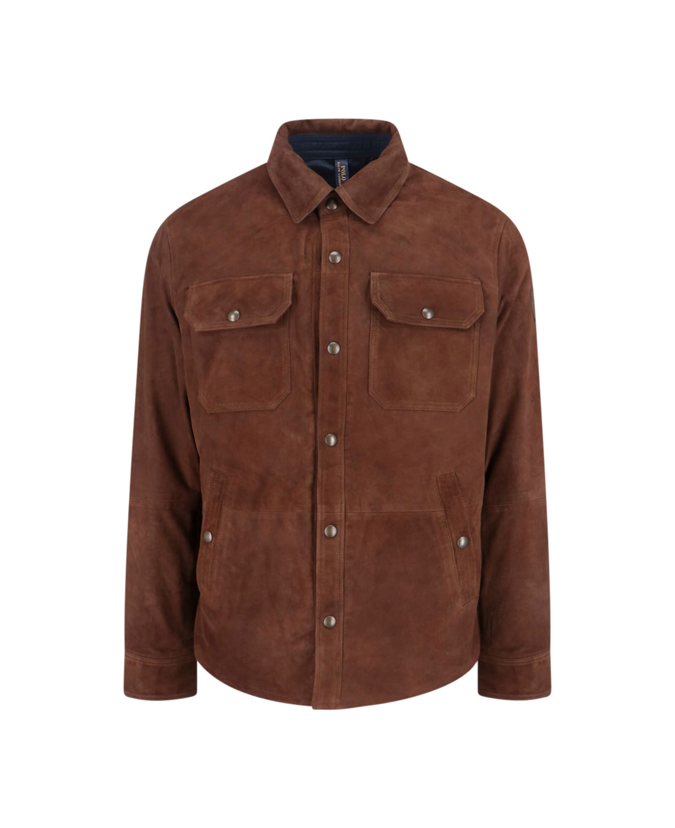 Polo Ralph Lauren reversible suede jacket in brown leather on one side, blue fabric on the other, classic collar, front button closure, long sleeves, two front button flap pockets, two slanted front pockets, button cuffs, side logo patch, straight hem.